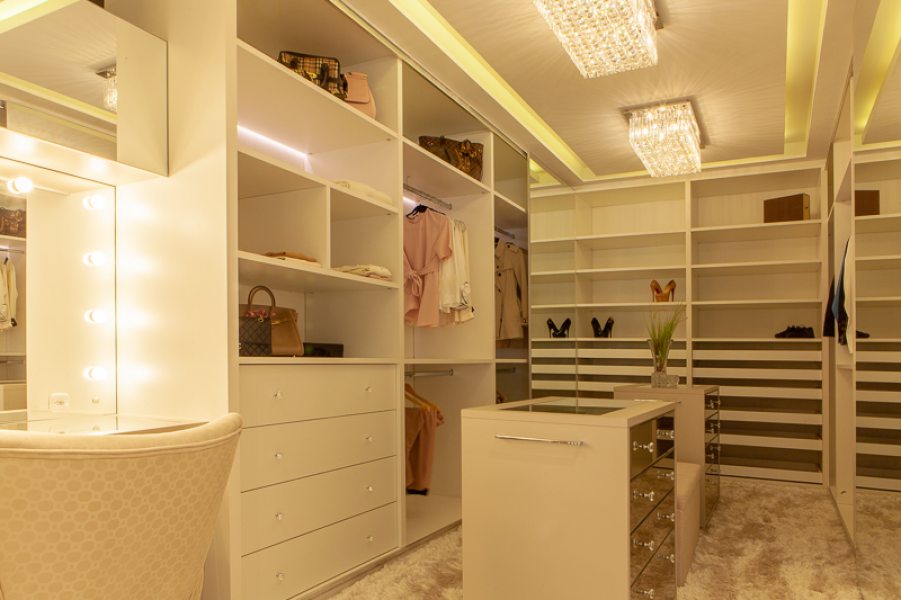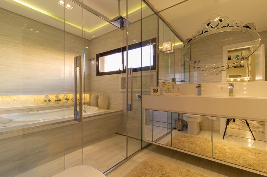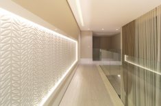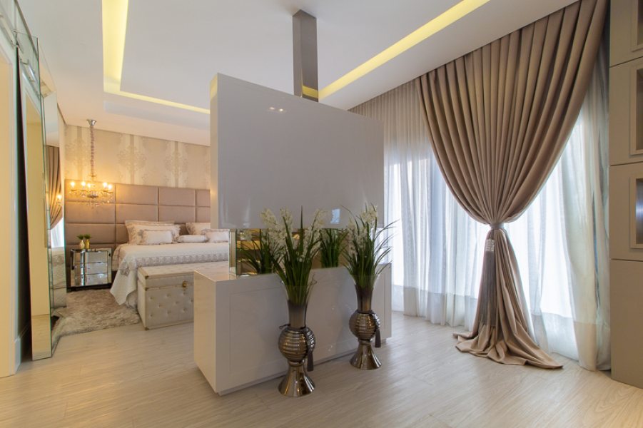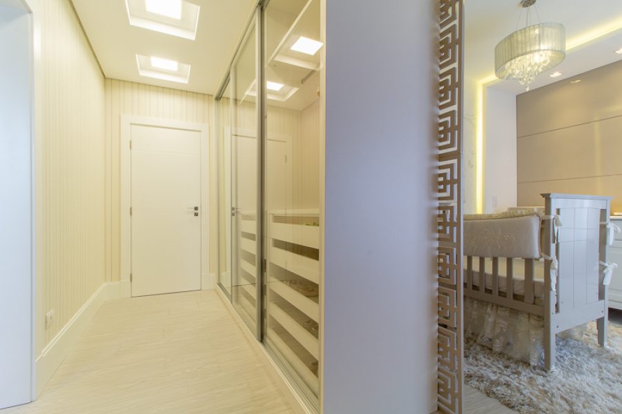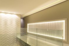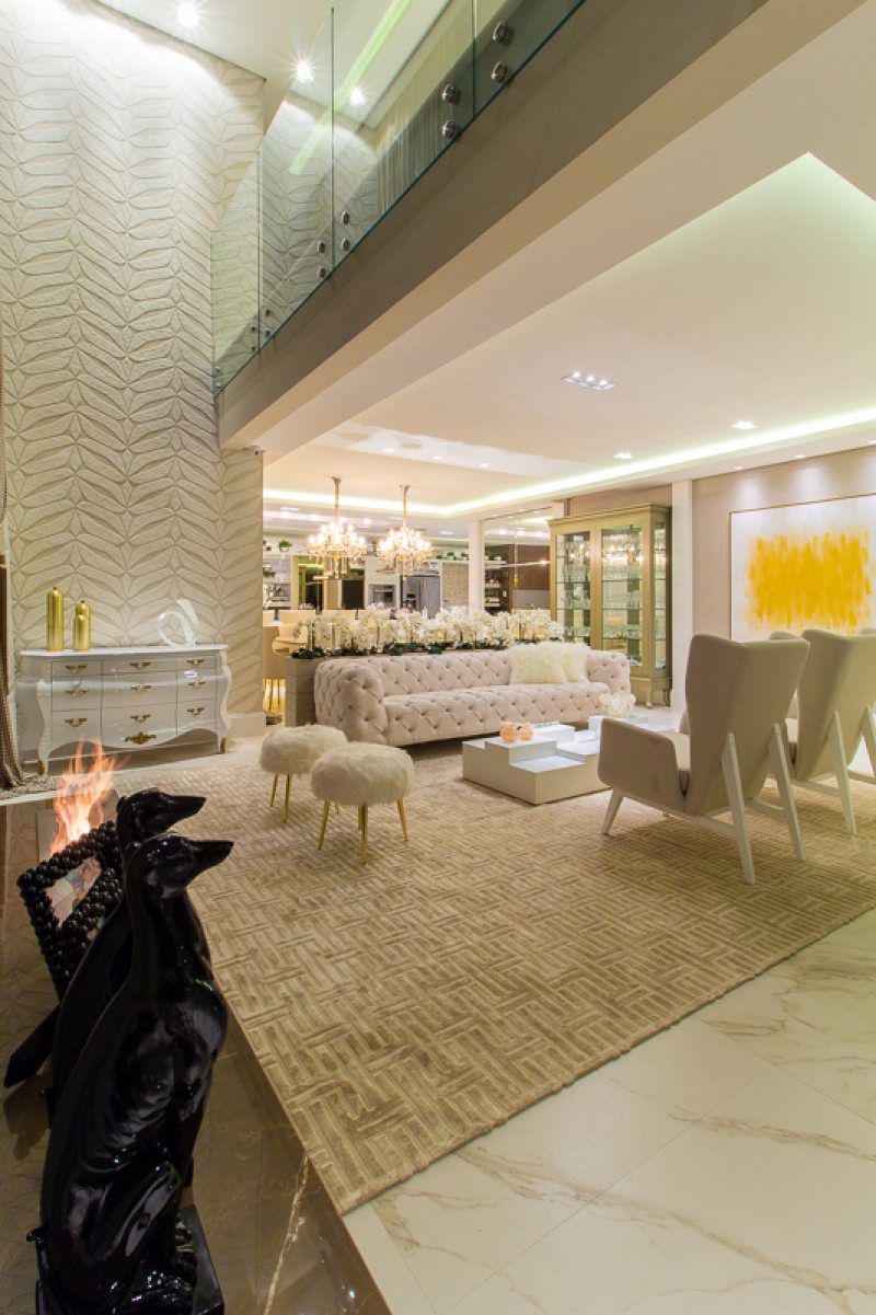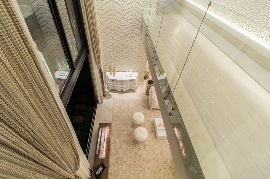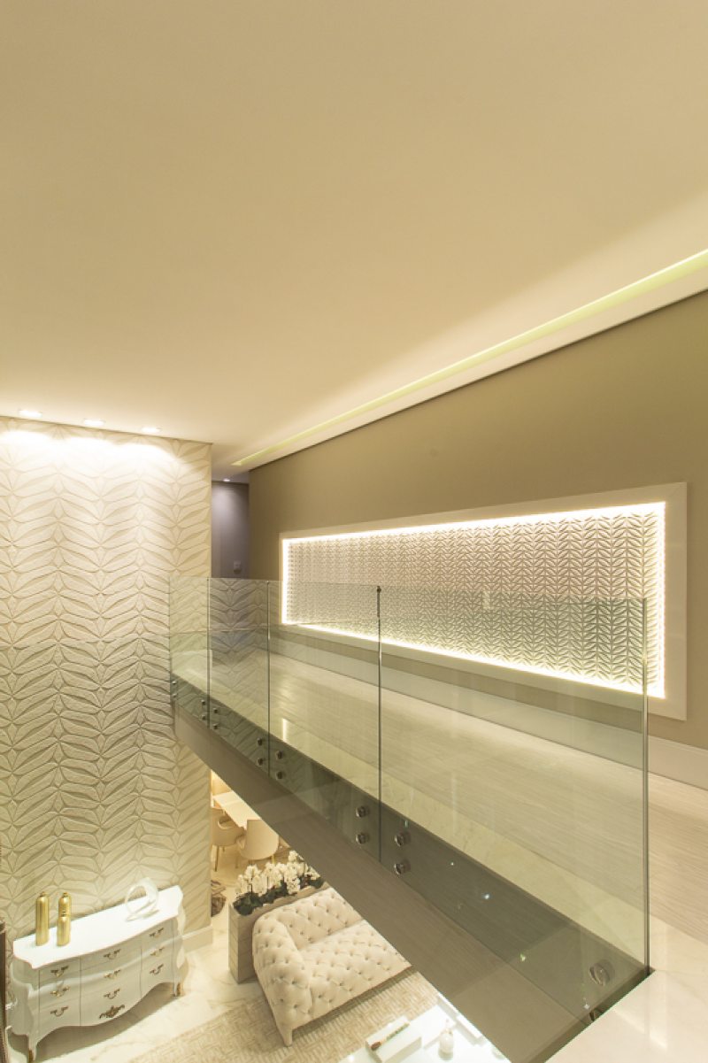é acompanhado em toda sua extensão por um nicho revestido com material 3D e iluminação indireta, além de guarda-corpo elevado em vidro para maior segurança. A suíte máster conta com pendentes