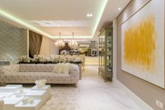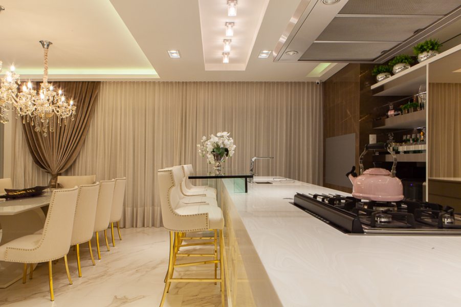 acomodar um trio de banquetas. “O Corian é um tipo de resina bem interessante de se trabalhar. Esse modelo Ônix White é um lançamento da Decorea e pode ser montado na hora, sem emendas, contribuindo para um resultado visualmente harmônico”, conta Bianca. A iluminação em toda a área social é trabalhada em rasgos no teto, com fitas de LED e spots pontuais ressaltando móveis e objetos, além de pendentes decorativos em cristal.