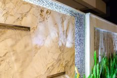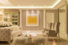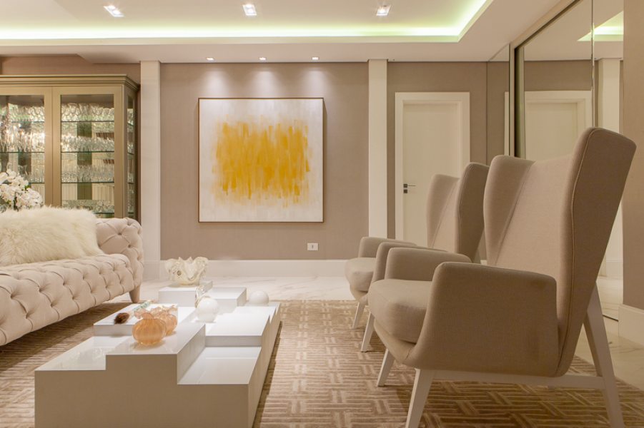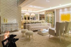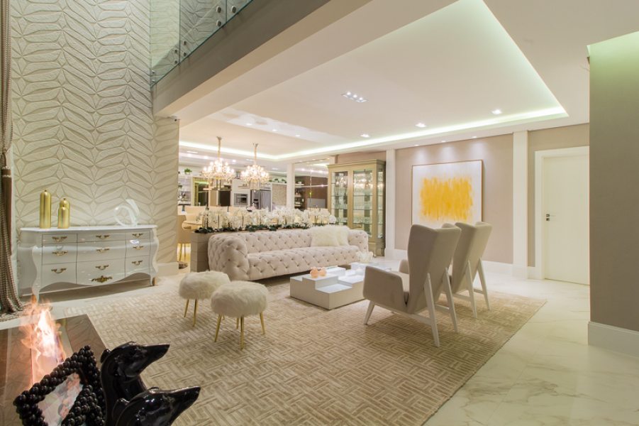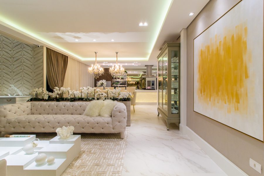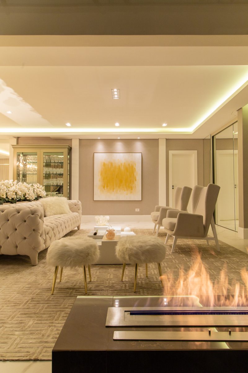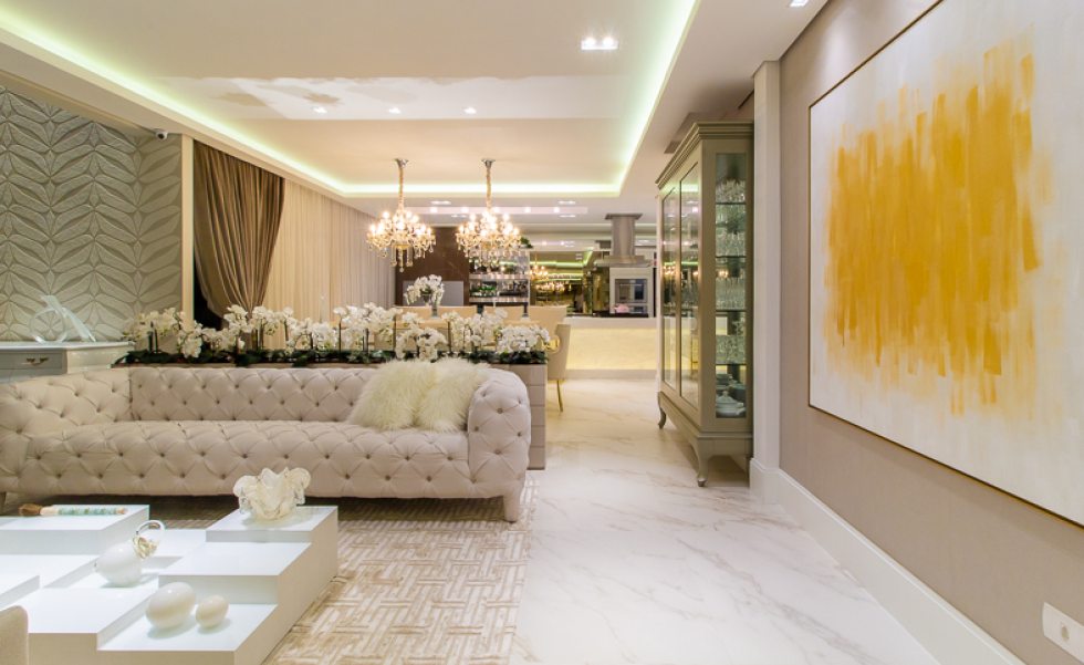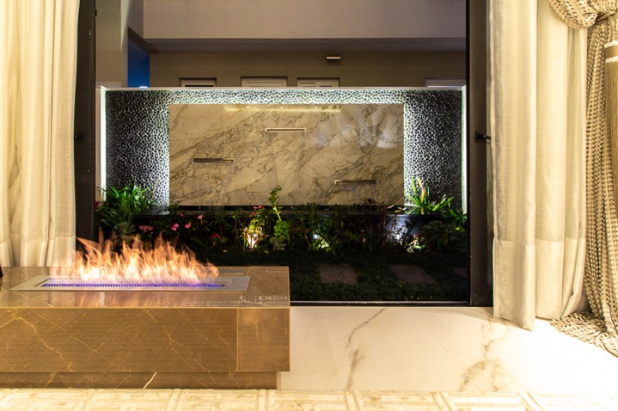 O hall de entrada e toda a área social receberam piso de porcelanato tipo Mármore Calacatta acetinado extrafino, da Portobello Shop, servindo de base para o mobiliário e objetos de decoração em tonalidades que variam do branco ao fendi, com pontos específicos em dourado. O sofá em capitonê off-white recebeu almofadas brancas de pelo, combinando com a dupla de pufes com pés dourados. Um nicho executado em marcenaria sob medida abriga um canteiro de orquídeas brancas, acompanhando o espaldar do sofá e a parte de trás do buffet espelhado. A lareira à etanol revestida com porcelanato tipo Mármore Bronze Armani, da Eliane (Pastilhart), e a cascata externa com mosaico de pedras pretas e chapa de mármore, iluminada por fitas de LED, criam uma interessante composição com fogo e água.