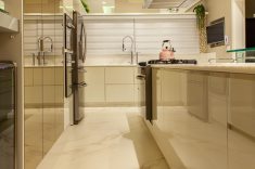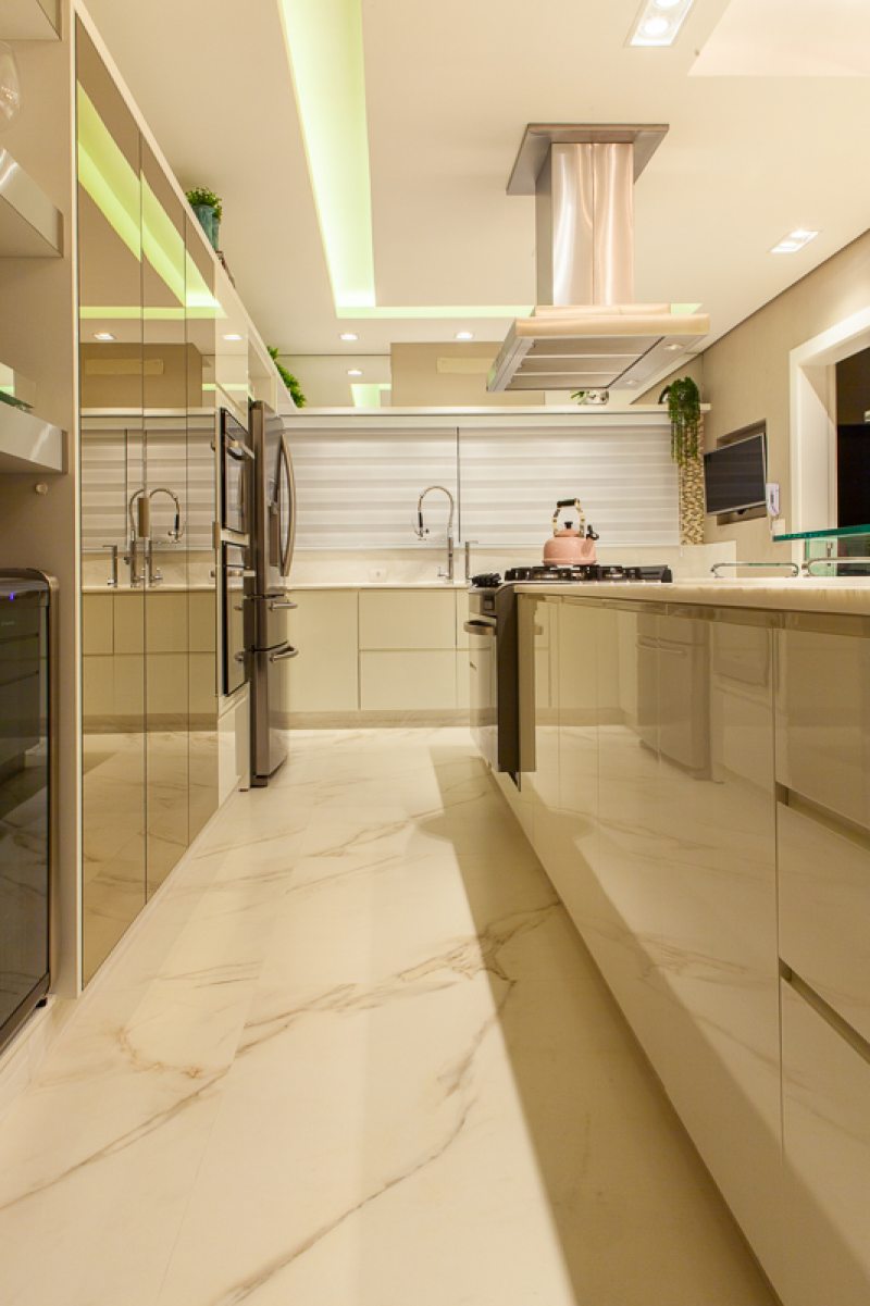 gourmet recebeu bancadas em Corian Ônix White, retroiluminada, da Decorea, e balcão em vidro para