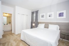 Com paleta em tons sóbrios em cinza, preto e branco compõem o ambiente confortável e receptivo para os futuros hóspedes.