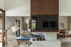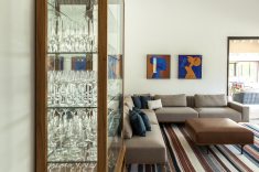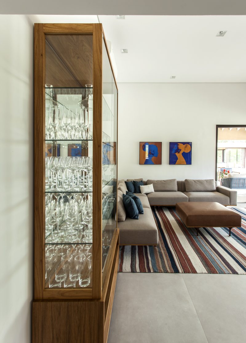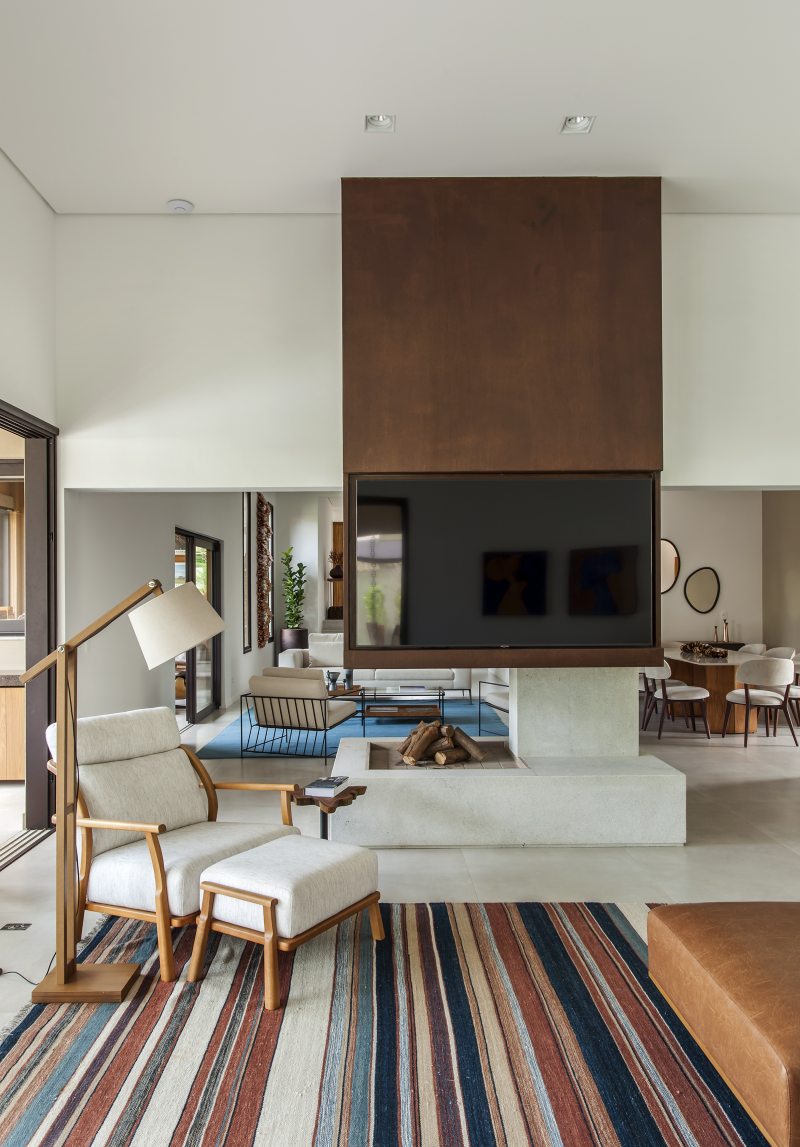 A lareira de ferro,com pintura de aço corten, e a cristaleira, desenhada exclusivamente para a família, são os charmes da sala de televisão, ao lado. "Uma solução bem interessante dessa integração foi que, após retirarmos a parede que terminava a casa, aproveitamos o pilar para construir uma lareira escultural que passou a dividir a sala de estar da sala de televisão. O elemento será muito bem aproveitada nas noites de inverno, quando a família poderá se reunir para ver um filme e se aquecerem juntos", explicou Carina Korman.