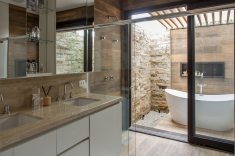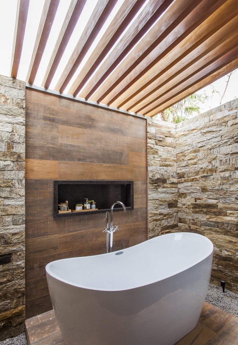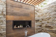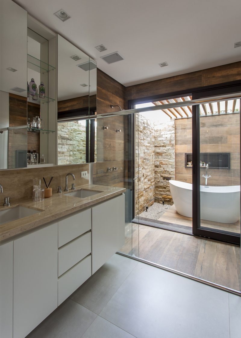 O banheiro da suíte, inteiramente reformado e ampliado, ganhou uma bancada de mármore travertino romano e porcelanato amadeirado que se estende do piso às paredes. O acesso a uma área externa com banheira freestanding e revestimento de pedra madeira, típica da região da Itu, completa o espaço.