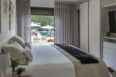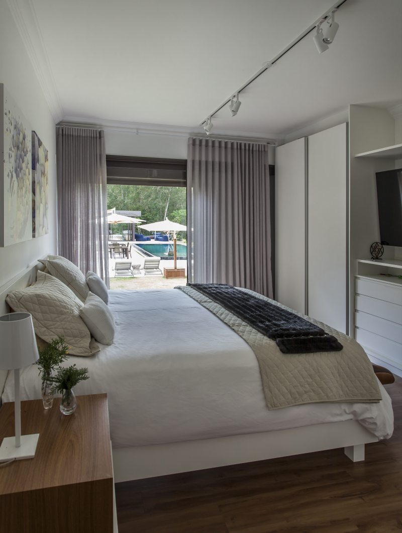Aproveitando a beleza da vista para o jardim, o quarto principal foi decorado com cores neutras e sóbrias para um resultado final leve e discreto. "Aplicamos o branco na pintura e na marcenaria, em grande parte do quarto, para caracterizar aquele visual clean, afinal é uma casa pensada essencialmente para o descanso", disse Carina.