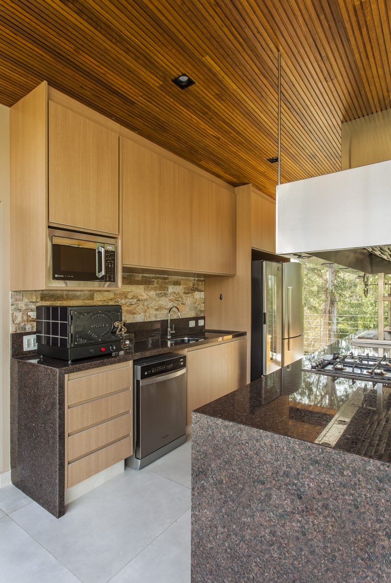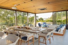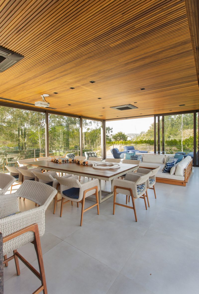 "Escolhemos essa pedra por ser um material extremamente resistente para uma área de amplo uso. Optamos pela cor em tons de marrom para combinar com a casa e para que não manchasse muito", explicou Carina. "A edificação ganhou salas de convivências para receber diversos convidados. O primeiro com uma mesa de 12 lugares e a segunda com sofás e poltronas superconfortáveis para relaxar curtindo a paisagem", completaram as arquitetas.