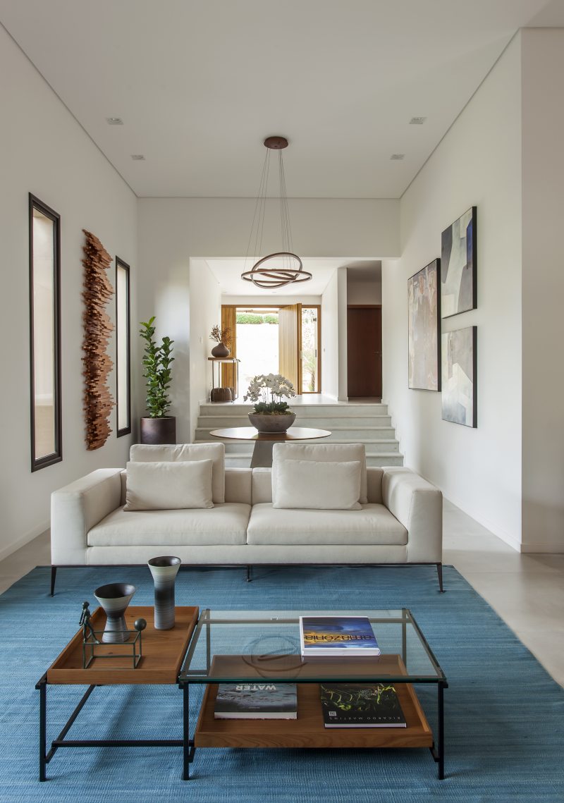 A sala de estar segue o mood contemporâneo do hall de entrada e ganha um toque colorido com o tapete azul de Kilim. A sala de jantar integrada, com uma mesa de oito lugares e décor dinâmico, ganha destaque a partir do trio de espelhos acima do buffet.