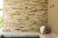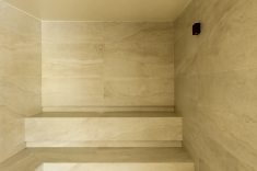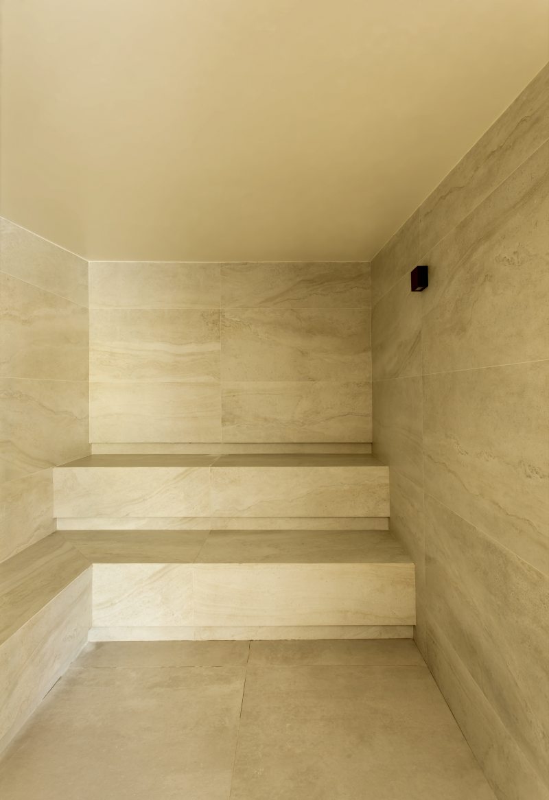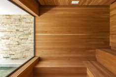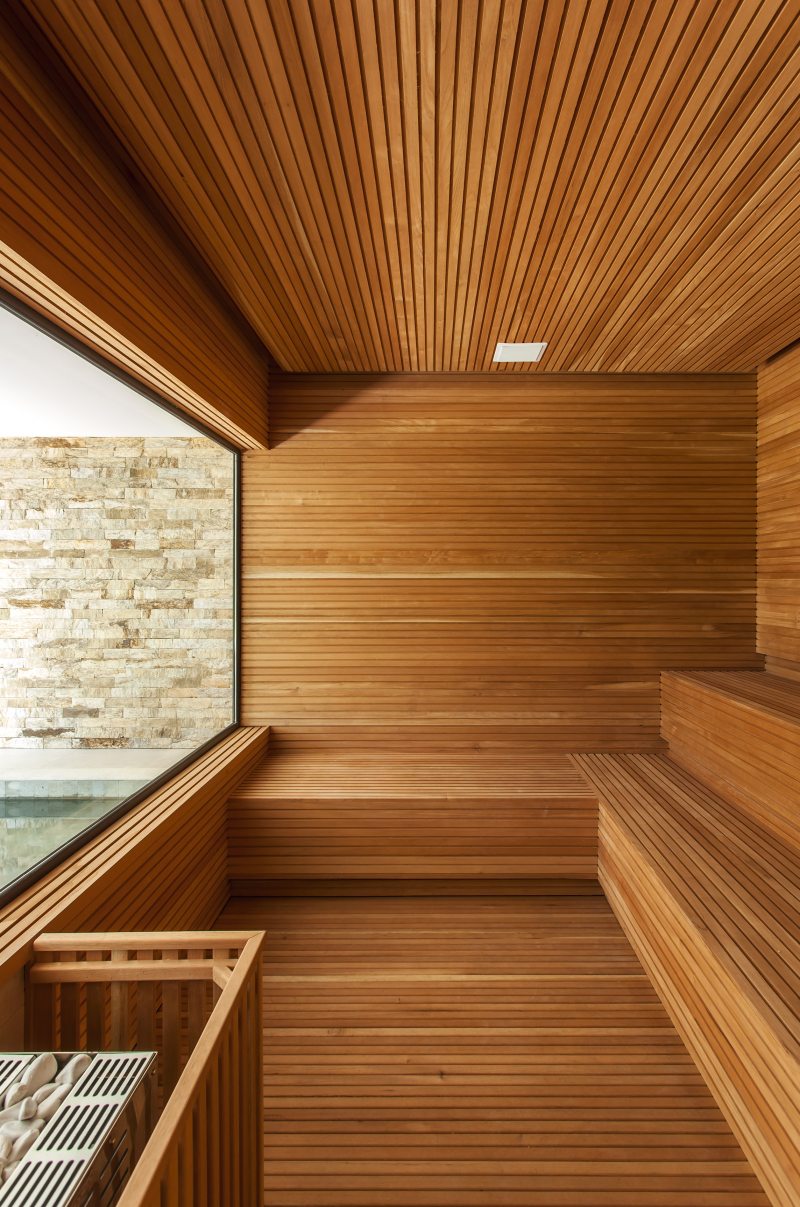 O segundo pavimento guarda os cômodos favoritos dos moradores da casa de campo: as saunas. Esses espaços, perfeitos para o período de inverno, oferecem opções de sauna úmida e seca para atender a um pedido dos clientes.. "Pensamos nos mínimos detalhes, pois foi um pedido duplo, uma vez que cada um queria um tipo de sauna. Realizamos as duas com iluminação indireta de fita led vedada e posicionada abaixo dos bancos e ao redor do forro", completa Carina.