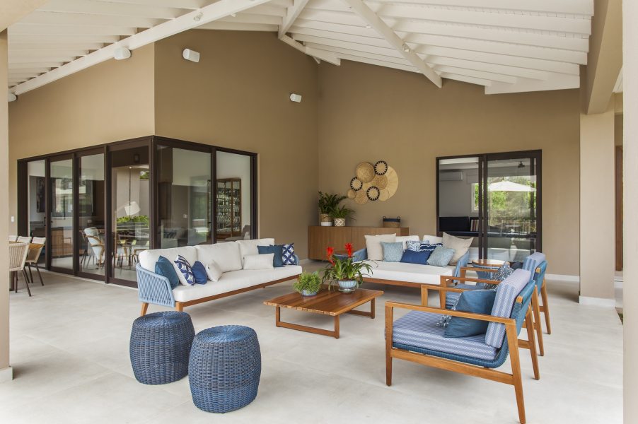 Na varanda da casa principal as arquitetas idealizaram dois ambientes: no primeiro, a grande mesa com 10 lugares garantiu que ninguém fique de fora dos descontraídos café da manhã e da tarde; no segundo, o lounge oferece espaço para descansar e bater papo nos fins de tarde. "Diferente dos tons de dentro da casa, aqui nós aproveitamos para colocar inserir diversas nuances azul, com estampas, texturas diferentes e móveis de corda náutica", disse Ieda.