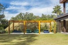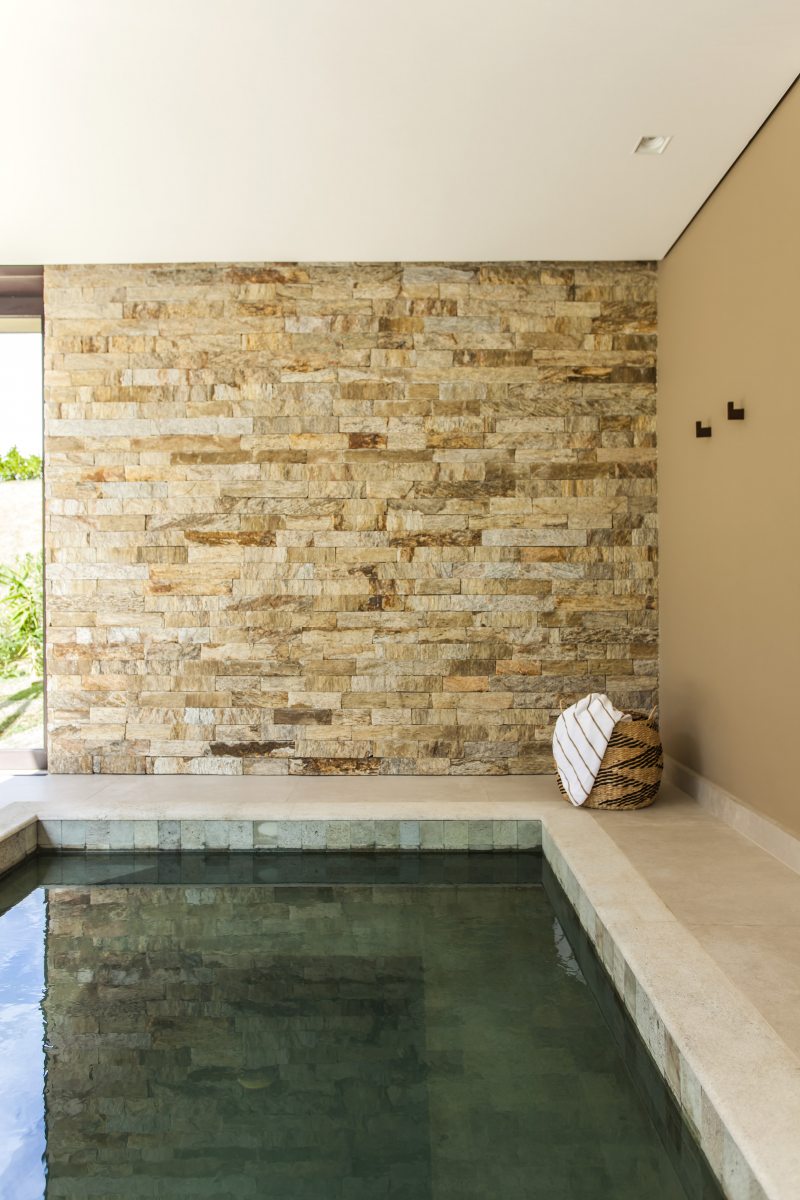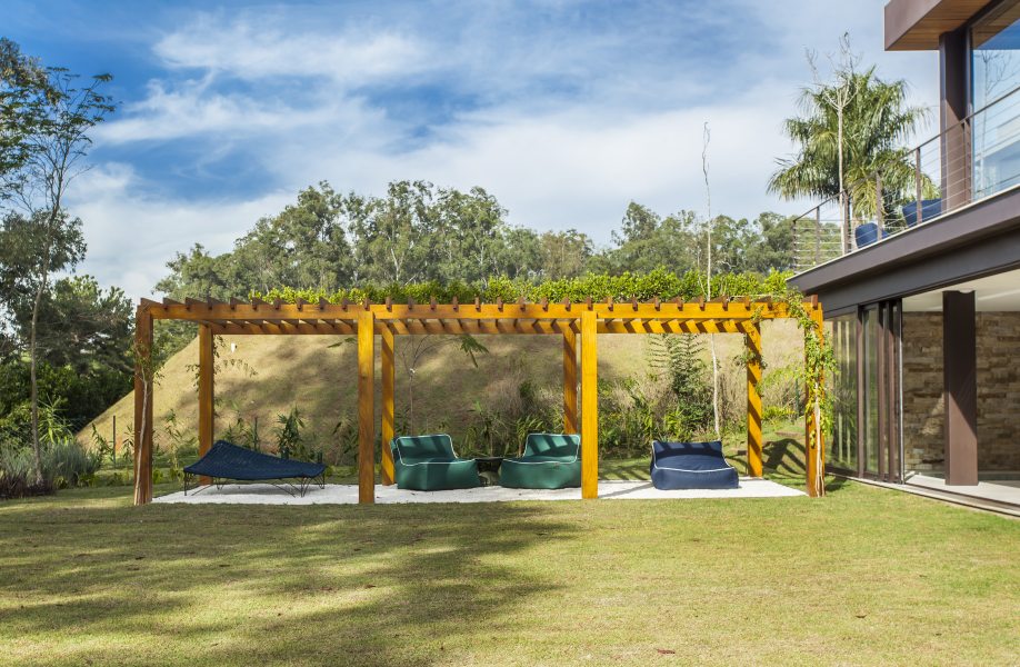 Ainda na mesma área, o spa aquecido oferece um espaço para que os moradores descansem ao saírem das saunas e tomem um banho com água fria ou morna. "No andar inferior do anexo da casa, implementamos uma área de descanso para tomar sol e relaxar. Na constituição, o pergolado é acompanhado por espécies de plantas que, segundo Catê Poli, crescerão daqui um tempo, propiciando uma sombra muito gostosa", disse Ieda.