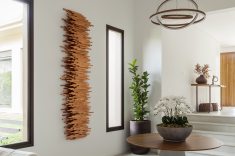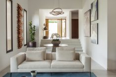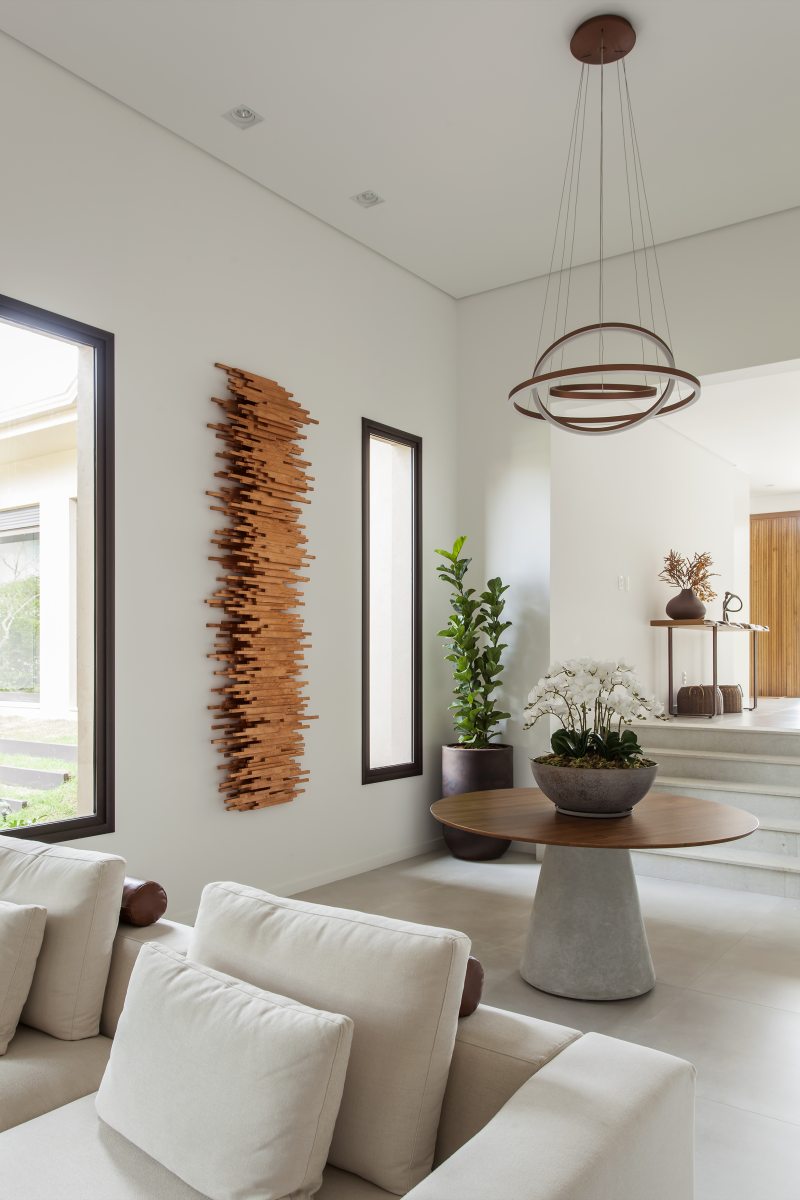 Para o hall de entrada, a arquiteta Carina Korman aproveitou o pé direito duplo preexistente para criar uma gallery wall com obras de arte maiores. "Procuramos fazer um hall, ao melhor estilo entrada de hotel, com muita personalidade. Exploramos bastante as peças artísticas e, para completar, um lustre bem decorativo, com aros de led logo chama atenção de quem adentra a casa. O resultado ficou maravilhoso!", comemorou.
