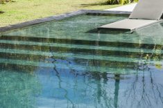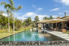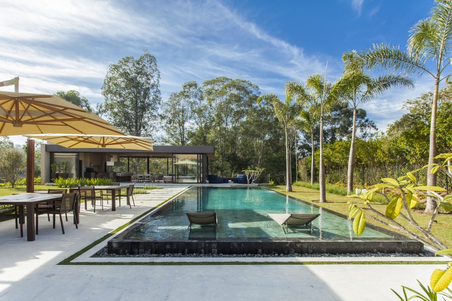Na área externa, a piscina foi posicionada próximo a varanda da casa principal e ao anexo, de forma que todos pudessem aproveitar. A construção, com profundidade de até 1,40m e uma borda infinita com revestimento de pedra hitam, produz um contraste entre as tonalidades dos materiais. "Como em Itu o sol bastante presente, ombrelone era um item que não poderia faltar. Definimos peças grandes de fácil rotatividade para sombrear qualquer canto", conta Carina. Para completar, a cenografia destaca as chaises e mesas de alumínio que não esquentam no calor.