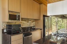 Além da renovação das estruturas preexistentes as arquitetas expandiram o imóvel adicionando um anexo com área gourmet, saunas, spa e espaços de convivência. O volume totalmente envidraçado insere o imóvel em meio à paisagem e tira partido das vistas para a casa e para a mata. O primeiro pavimento do anexo abriga a área gourmet: equipada com cooktop, churrasqueira, forno de pizza e coifa industrial, o layout do ambiente circunda a ilha central com tampo de granito "café imperial".