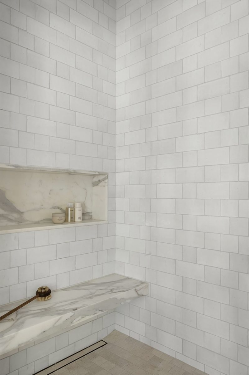 A fachada em tijolo branco e as linhas de cobertura bem definidas estabelecem a linguagem do projeto, que evita excessos formais e aposta em proporções equilibradas. A partir dessa estrutura, os ambientes internos exploram texturas, luz natural e elementos fixos que organizam os espaços com discrição.