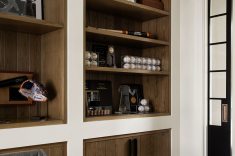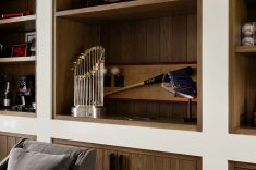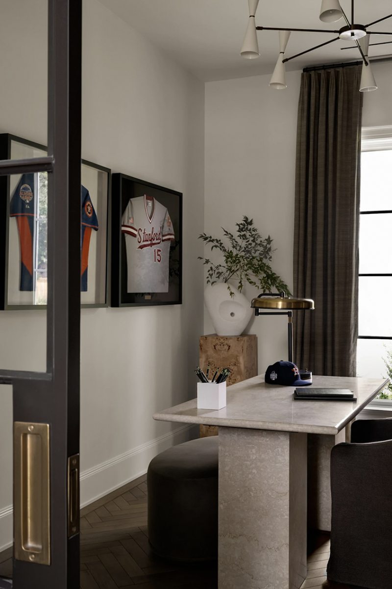 Um dos pontos que reforçam o caráter pessoal do projeto é a área dedicada à exposição de memorabilia do beisebol, incorporada à marcenaria. O recurso revela como arquitetura e interiores também acomodam a história de quem vive ali, sem recorrer a elementos chamativos.