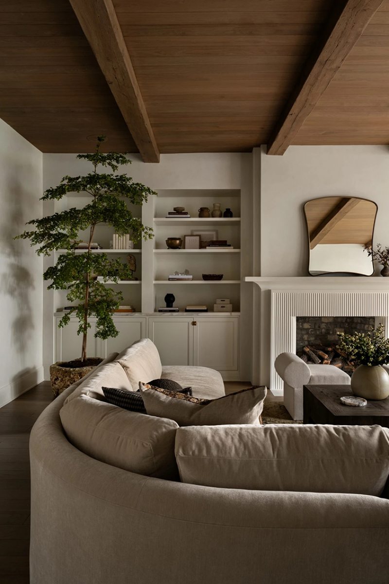 A iluminação natural conduz a experiência da casa ao longo do dia, criando cenas que variam entre áreas de convivência junto à lareira e cantos mais reservados. Os materiais naturais e o desenho limpo ajudam a construir uma atmosfera silenciosa, pensada para a rotina familiar.