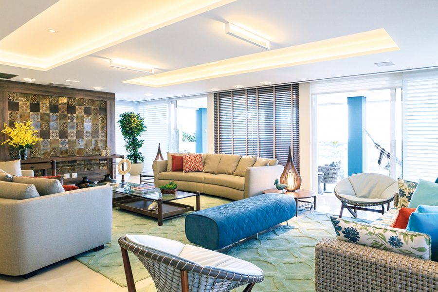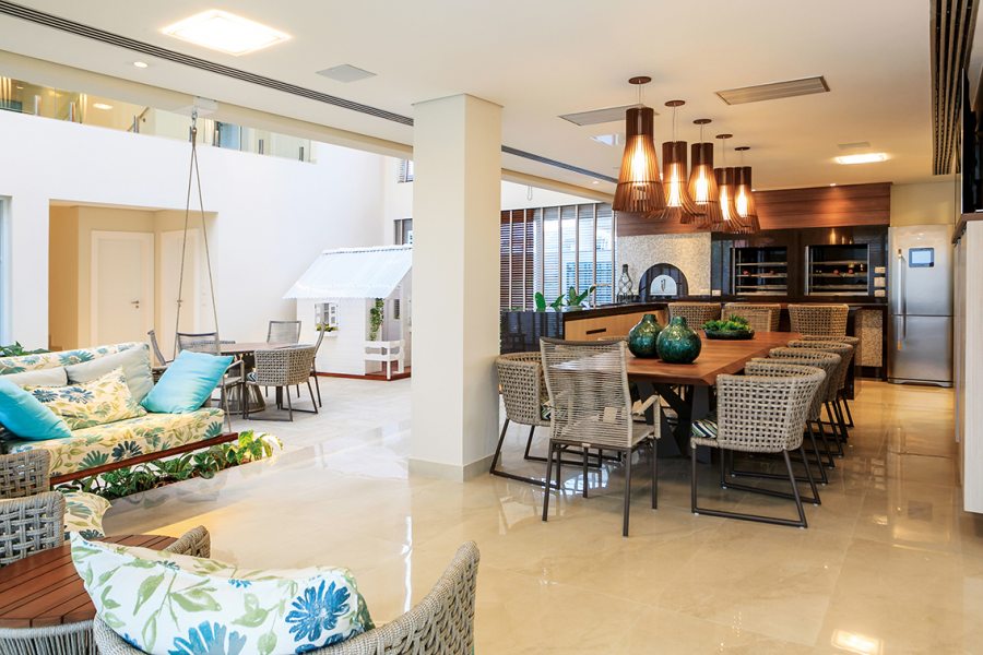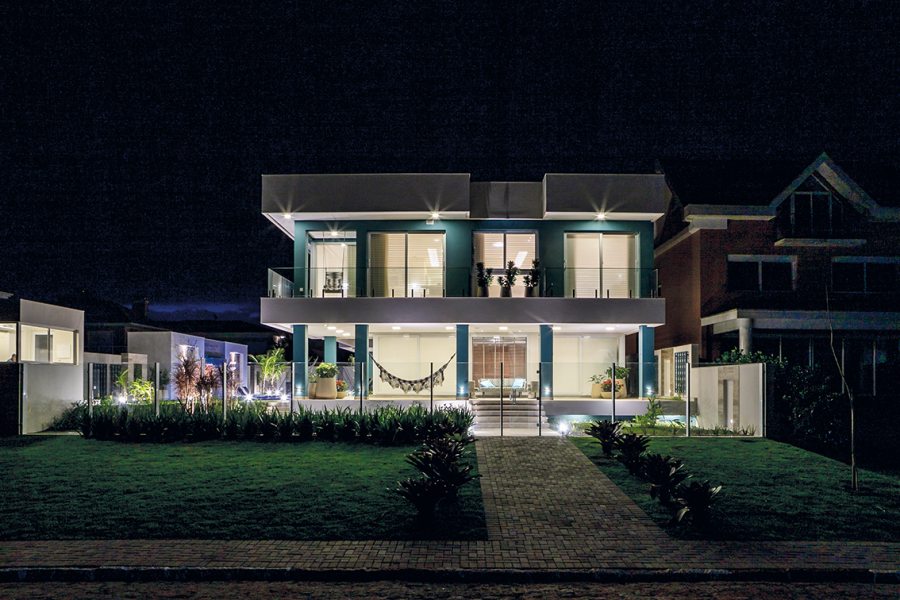 Os sofás, mesas, cadeiras e toda a linha de móveis externos em corda náutica, da Tidelli, foram adquiridos na Ton Sur Ton: “Escolhi a Ton Sur Ton pela grande variedade de opções, além de o atendimento e a qualidade dos produtos serem excepcionais”, elogia a profissional. A paleta de cores com tons de verde e azul aparece tanto nos tecidos e detalhes da parte interna da casa quanto na fachada. “A ideia principal era que o resultado refletisse uma casa de veraneio no litoral, que fosse arejada e ampla, mas ainda assim muito elegante”, finaliza Solange.