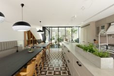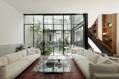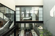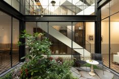 No térreo, o antigo jardim acima do nível da rua foi convertido em um pátio suspenso que conduz à entrada principal de maneira agradável. No interior, outra surpresa: o átrio central com jardim valoriza a iluminação e ventilação naturais, além de conectar os diversos andares e servir de acesso entre a ala antiga e atual da residência.