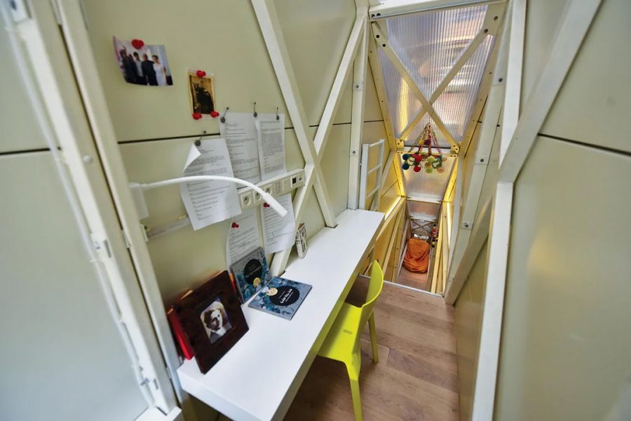A Keret House, em Varsóvia, projeto criado pelo arquiteto polonês Jakub Szczesny em 2012, foi construída no vão entre dois prédios e tem largura que varia de aproximadamente 72 cm a 1,22 m. Apesar da largura mínima, a casa tem dois níveis, uma pequena cozinha, banheiro compacto, espaço para dormir e área de trabalho. A circulação é vertical, com escadas tipo escada-naval, e praticamente todo o mobiliário é feito sob medida.