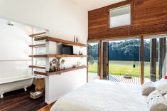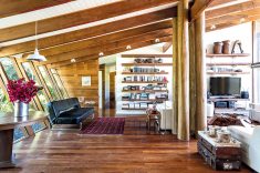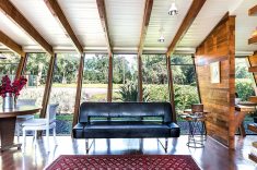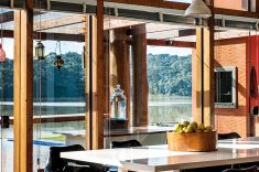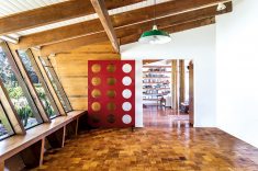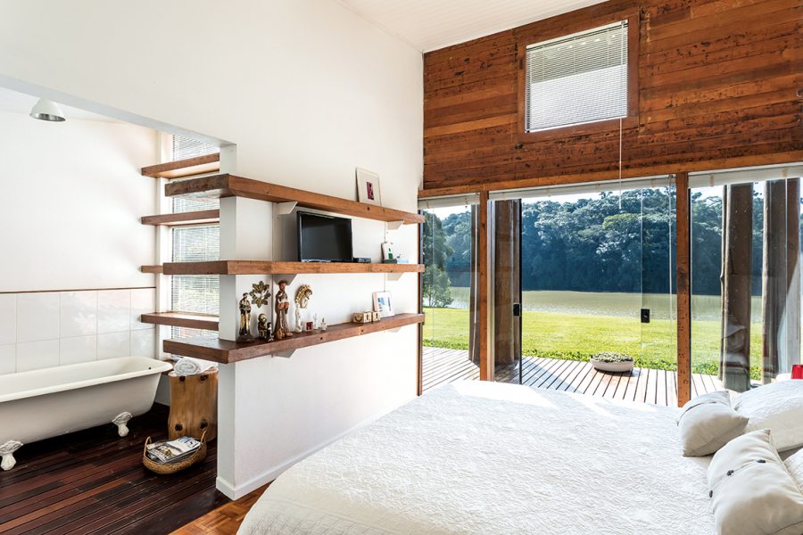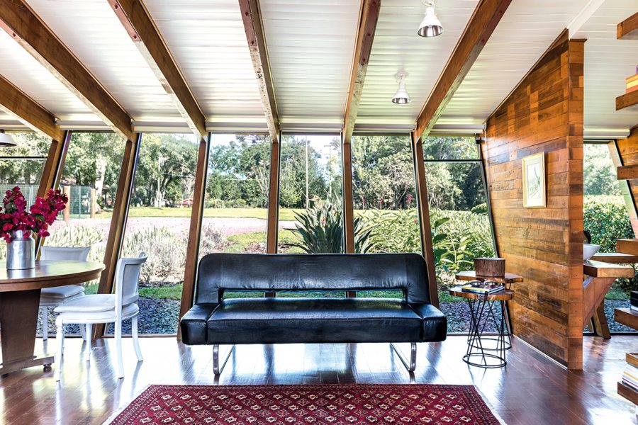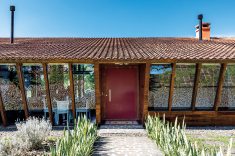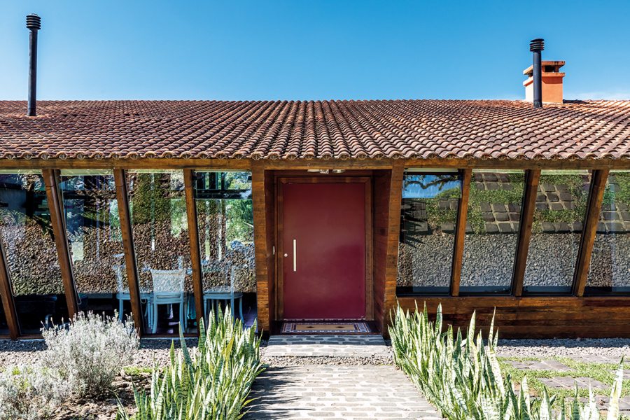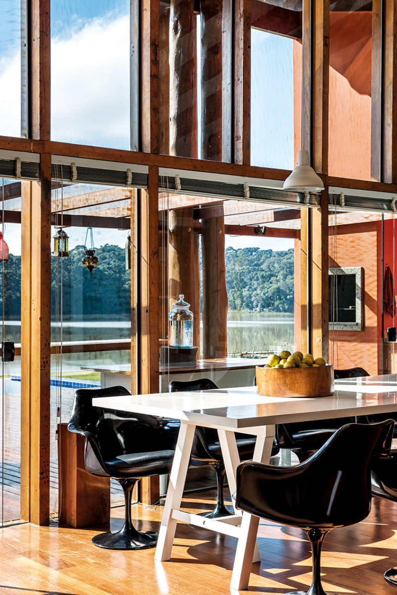 A casa com arquitetura modernista recebeu vigas de madeira com modulação repetida, criando movimento e emoldurando as amplas aberturas que privilegiam a entrada de luz natural. A decoração é composta por armários feitos com o pinho retirado do moinho da família e por objetos trazidos pelo casal de suas viagens pelo mundo. “Tudo é muito integrado e fluído, o que gera uma sensação de amplitude, conforto, alegria e paz”, sintetiza o arquiteto.