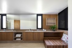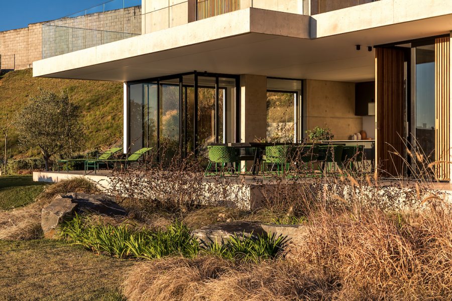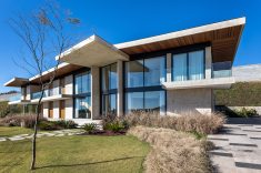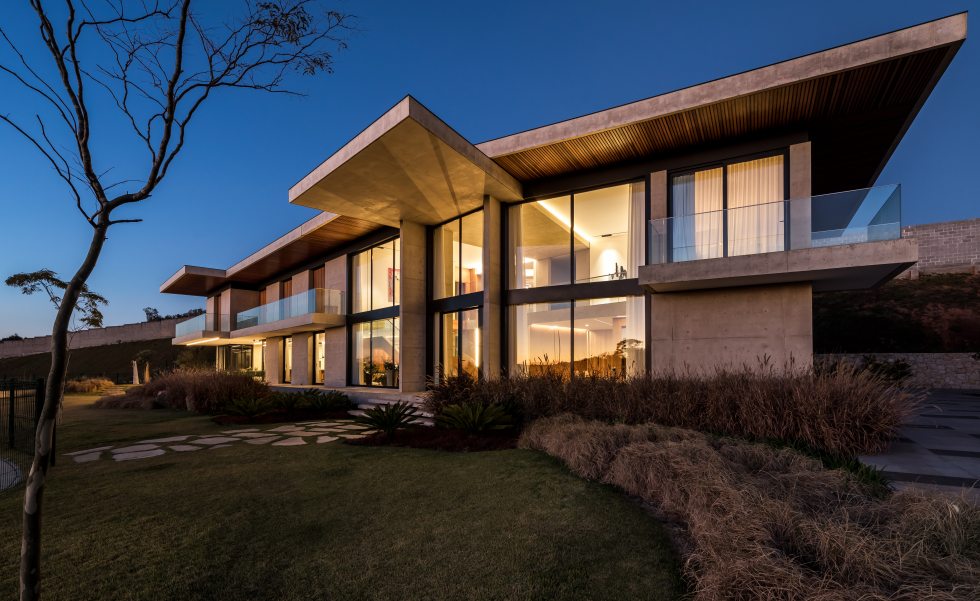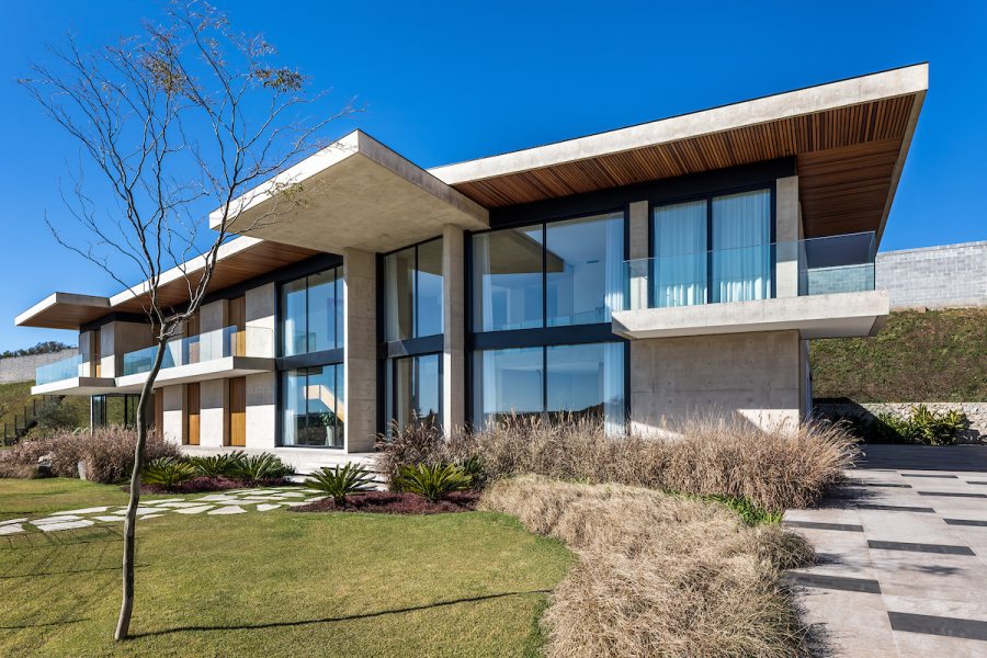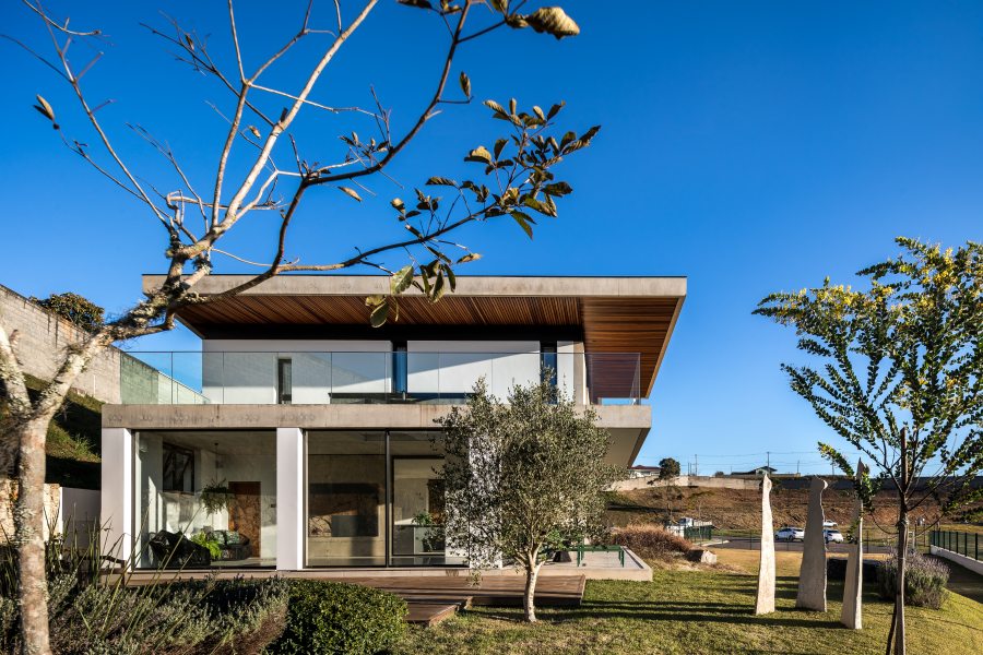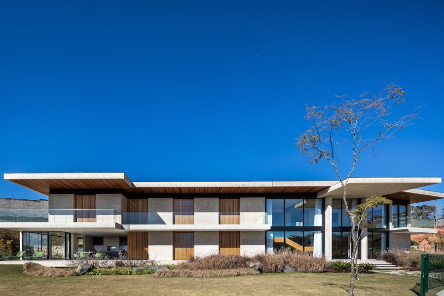 Linhas retas e proporções longilíneas evidenciam a grande influência da arquitetura modernista e do décor escandinavo neste projeto. O aspecto imponente dos volumes construtivos em concreto ficou mais equilibrado graças à inclusão de brises em madeira louro-freijó e amplas esquadrias e guarda-corpos de vidro. A grande integração entre ambientes internos e externos foi alcançada por meio da varanda que circunda a casa, com estrutura protendida e laje superior suspensa por tirantes. O paisagismo exuberante e a iluminação cênica finalizam a área externa.