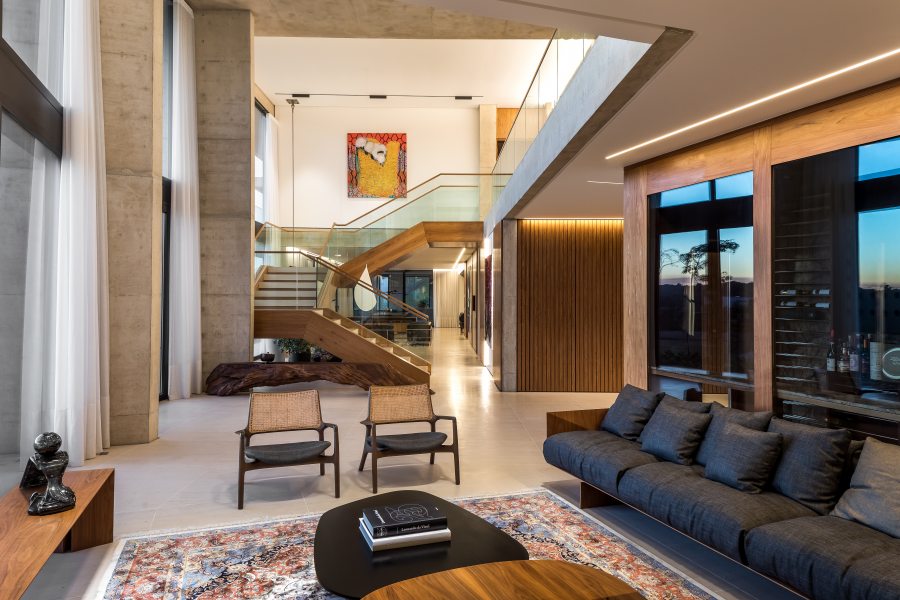 Construída em um terreno elevado, em um condomínio fechado no bairro Riviera, em Curitiba, a residência é o lar de uma família de cinco pessoas que adora conviver e receber convidados.