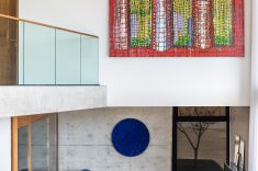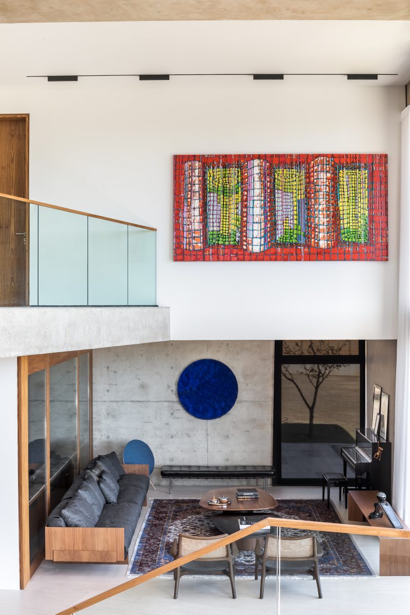 No décor, a influência do décor escandinavo fica evidente a partir da paleta de cores clara e do uso de materiais construtivos em seu aspecto natural. As paredes de concreto, com tirantes aparentes, fornecem um contraponto sóbrio ao colorido vibrante das obras de arte.