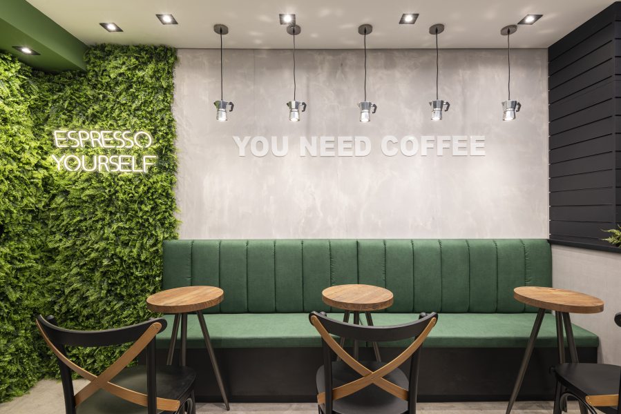 Buscamos criar um refúgio em meio à cidade através dos contrastes de cores como verde, preto, branco e revestimentos naturais. Elementos marcantes como a arte urbana, grafitti e parede de assinaturas também ajudaram a transformaram as lojas em espaços de interação da marca com o usuário. Letreiros de neon, jardins verticais e sinalizações de marca bem personais convidam a “pausar, relaxar e ir” - ou a pegar um café e ir apreciando no caminho. O layout para servir foi pensado para inovar a proposta das cafeterias e fugir dos clichês: a interação e proximidade entre a marca e o cliente criam um refúgio dentro da cidade, onde você consegue relaxar nos poucos minutos livres do dia.