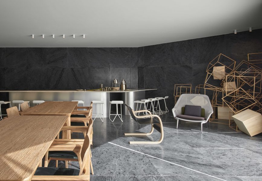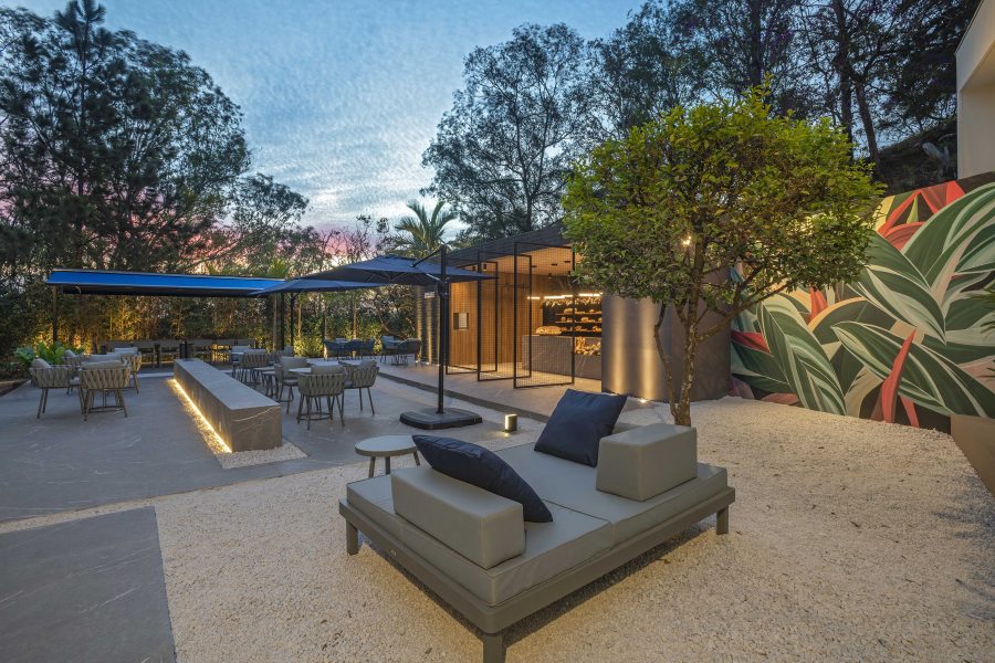 O espaço do café é, antes de tudo, um ponto de encontro, de convivência e, ao mesmo tempo, de contemplação do entorno. Para a área externa, o balcão e um banco de 9m de comprimento, foi usado o porcelanato Pulpis, de 1m x 1m, bastante versátil. O mobiliário tem detalhamento das cadeiras assinadas pelo arquiteto em forma orgânica e revestimento em tecido impermeável em tom de cinza com detalhe em grafite. O espaço ganhou toldo motorizado e ombrelones, tudo azul marinho. Internamente, o revestimento do pavilhão é em porcelanato grafite em relevo, que, com iluminação cria efeito tridimensional, tanto na parte externa quanto interna, dando efeito de caixa. A cor aparece de forma mais vibrante na parede com painel pintado pelo artista Thiago Mazza, com folhagens que remetem a Burle Marx e também na parede instagramável com a frase VOCÊ É A SUA CASA, em neon, junto a um jardim vertical. Durante a mostra, o café está sendo operado pela