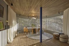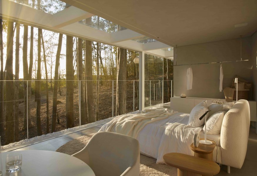 Desprendido do chão, o projeto dessa casa pretende estimular conexões e se inserir no contexto em que está implantado, sem interferir com ruído na paisagem. Graças à fachada mimética integralmente revestida por um espelho que cria jogo de esconde-esconde em meio ao bosque de eucaliptos. Uma grande passarela liga a rua ao espaço e investe em uma penumbra branca de reciclado têxtil, dando transparência e leveza à edificação. A casa voa, a seis metros do solo firme, permissão dada pela estrutura metálica de seu esqueleto, uma proposta que soma em volume à experiência de se estar presente consigo mesmo. Internamente estão dispostos a cozinha, a mesa, a cama, o closet, o banheiro e um espaço de meditação, tudo integrado com a leveza do concreto do piso e das placas de cimento que encapam uma parede longitudinal. Do lado oposto, o fechamento é em vidro, assim como uma parte do teto, que traz a luz natural e as árvores do terreno para participar desse momento. Destaque para as poltronas Carlos Motta, poltrona Lina, da Líder, em homenagem à Lina B oBardi, cama da São Romão e luminárias da Floss, da A. de Arte. Sobre a iluminação, mais um detalhe: ela também vem dos eucaliptos lá de fora.