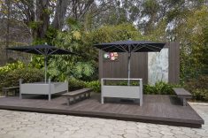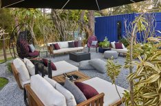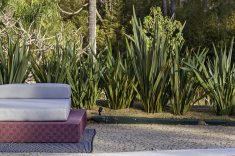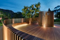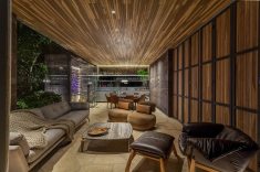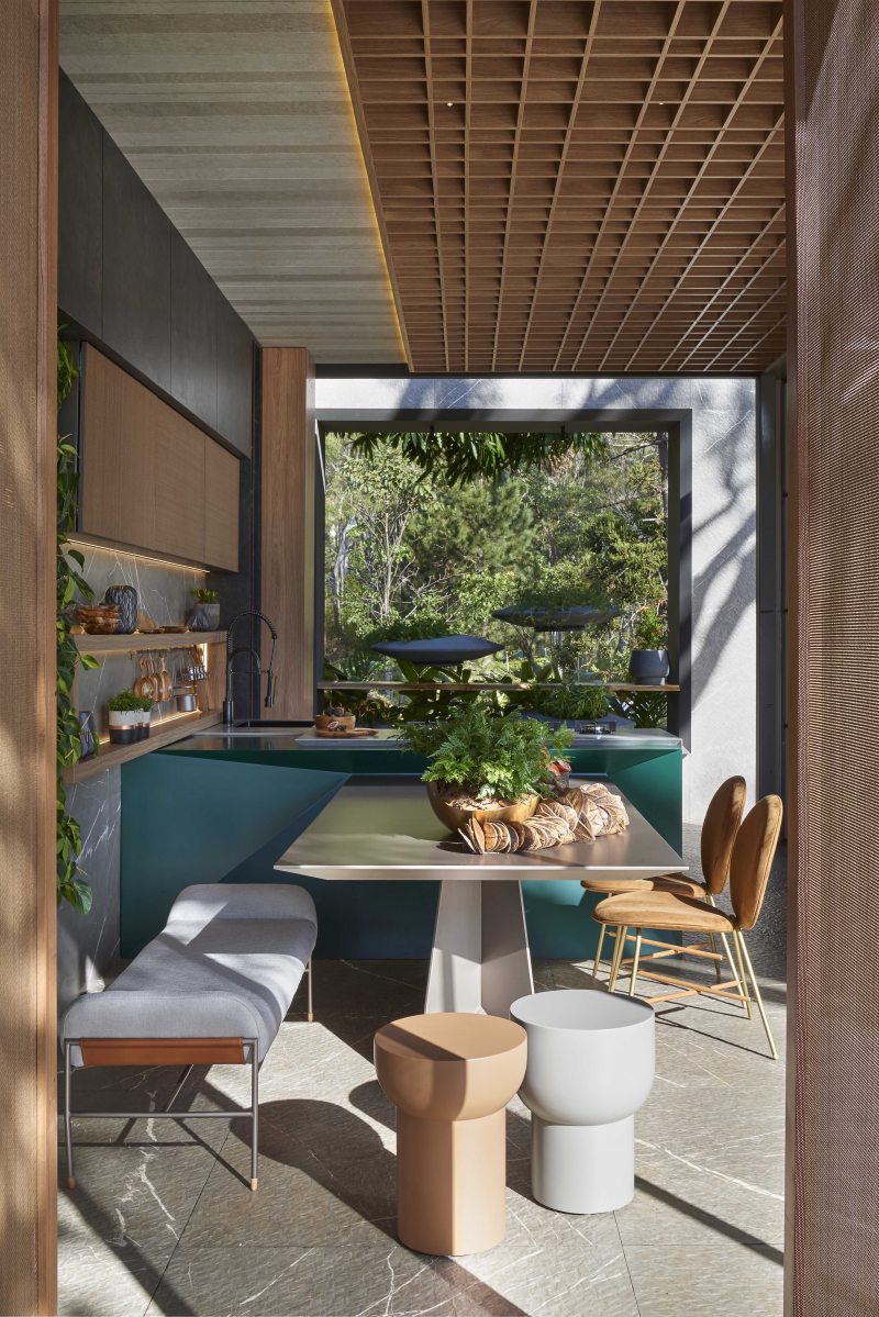 Mais intimista e propício para receber amigos e familiares, a proposta deste ambiente é ser um espaço que funcione como um laboratório de experimentações, mantendo tudo ao alcance da mão. Para isso, conta com uma estilosa horta de especiarias, distribuída em vasos suspensos que mais parecem discos voadores. Se o lounge é um convite explícito ao descanso, o gazebo é um aceno prazeroso para o ato de cozinhar. No acesso principal, patamares irregulares foram feitos na pedra Hitam. Já na parte lateral ele aparece em forma de rampa, que dá acesso ao lounge que, embora descoberto, foi pensado como um living, com móveis orgânicos dispostos de maneira irregular. Sobre uma prancha de madeira, o sofá grafite, em tecido que remete ao linho, é próprio para áreas externas e tem como complementos, as almofadas e mantas, em tons terrosos e cinza claro. Em um canto, uma composição de mesas de madeira em laca e alguns vasos dão o toque de sofisticação. Criando uma conexão natural, um jardim vertical suspenso atravessa o lounge e adentra o gazebo. Para reforçar o encantamento do lugar, duas poltronas Painho, de Marcelo Rosenbaum, pufes em corda náutica e tapete de Elisa Atheniense, em tons de cinza, também em corda náutica fazem composição harmoniosa. Destaque para o teto com iluminação embutida em colmeia irregular em madeira e para a frente do gazebo, toda feita em ripado de madeira natural, disposta de forma irregular tanto na largura quanto na profundidade.