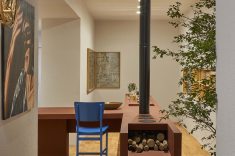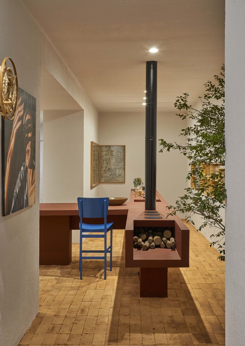 Os elementos da tradicional cozinha mineira estão todos lá: o fogão à lenha, os armários abertos, típicos de armazém de interior, o tijolo rústico, as frutas e os legumes à mostra. O layout mais limpo, entretanto, faz toda a diferença. Nessa releitura, uma ilha central em T abriga o fogão à lenha, a cuba e a mesa em um mesmo volume, com epóxi revestido em resina em vermelho fechado, que lembra o familiar vermelhão do cimento queimado das cozinhas de fazenda. Em linhas bem simples, feito em pinus, o armário organiza e é super prático. A iluminação embutida e a circulação, revestida em ladrilho hidráulico branco reforçam o aspecto clean. Uma jaboticabeira, comum em quintais mineiros, reaparece plantada em vaso. As obras de arte escolhidas para o projeto são interferências sutis que reforçam o sotaque do estado, porém em contexto contemporâneo, como é o caso dos trabalhos de Mabe Bethônico e Flávia Bertinato presentes do ambiente. Também faz parte desta proposta mostrar que é possível executar qualquer projeto com o que a Leroy Merlin oferece em suas lojas. Muito além de produtos industrializados, há uma gama de itens artesanais que podem dar uma dose de rusticidade a qualquer ambiente, como é o caso desta cozinha. Com exceção da cadeira e das obras de arte, tudo faz parte do mix de produtos da Leroy Merlin.