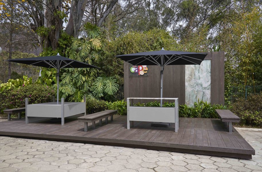 Situado próximo à entrada de acesso à mostra, o pequeno espaço funciona como um estande a céu aberto, com cobertura feita por dois ombrelones pretos que setorizam os usos: de um lado, destinado a uma ação social e, do outro, servir como lojinha da CASACOR Minas. Na composição, um só tablado em ecobloc, que à noite tem contorno da base toda iluminada e parece estar solto do chão e painel em mesmo materiail que o acompanha fechando a parte posterior. Nele, de forma localizada, um outro painel, de menor dimensão, na pedra amarantita retroiluminada foi aplicado de um lado e, do outro, está a logo do Cad. Os dois espaços foram separados por bancos secos, que também fazem o fechamento das laterais externas.