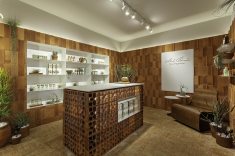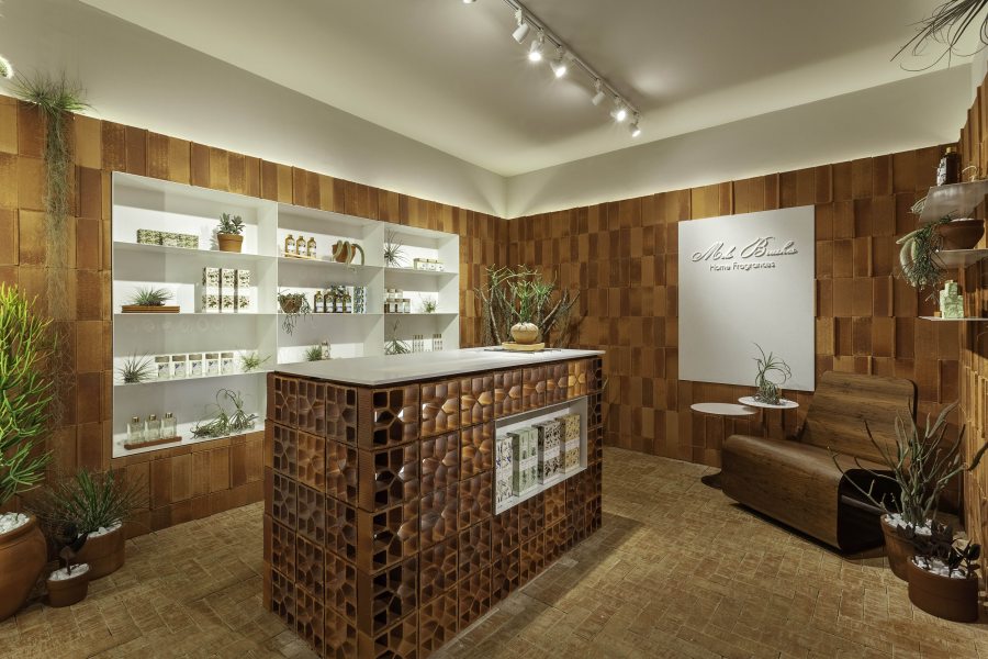 O projeto parte da ideia dos elementos essenciais da arquitetura contemporânea: os naturais e os artificiais, para criar uma dualidade. Colocados em cheque, o natural rústico e o artificial perfeito, apesar de parecerem distantes, convivem muito bem. São dois ambientes: a sala de exposição e um destinado ao caixa da loja. No primeiro, estão presentes uma ilha central em cobogó iluminado e uma generosa estante em chapa metálica dobrada, além de prateleiras espalhadas pelo ambiente em mesmo material. Na parte do caixa são duas bancadas: uma de exposição e outra destinada à atendente do caixa, ambas com o topo em corian e laterais em cobogó, uma iluminada e outra com armário.