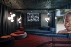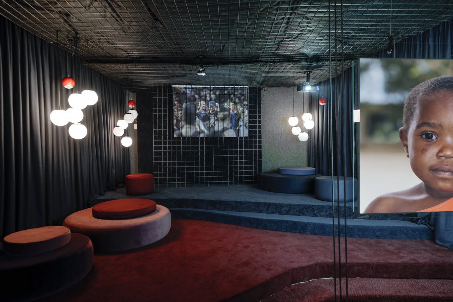 É como se a tela do smartphone, onde o mundo está ao alcance da mão nas mais variadas imagens, fosse ampliada para dar a sensação de imersão no que isso representa. Relacionado a um momento histórico do planeta em que tudo ao mesmo tempo agora está sempre a um palmo do nariz, o ambiente escuro, com cortinas e piso escuro e vergalhão no teto e na parede, maximiza essa sensação. Nesse espaço, vários vídeos mostram, simultaneamente, cenas urbanas, que podem ser vistas da forma como o espectador escolher: em pé ou sentado nos pufes redondos em monocromia. Eles foram dispostos de forma aleatória nos patamares orgânicos, setorizados pela faixa vermelha escuro do patamar central. A forma esférica também está no formato das caixas de som espalhadas no ambiente e na iluminação, que tem cacho de bolas dependurado no teto.