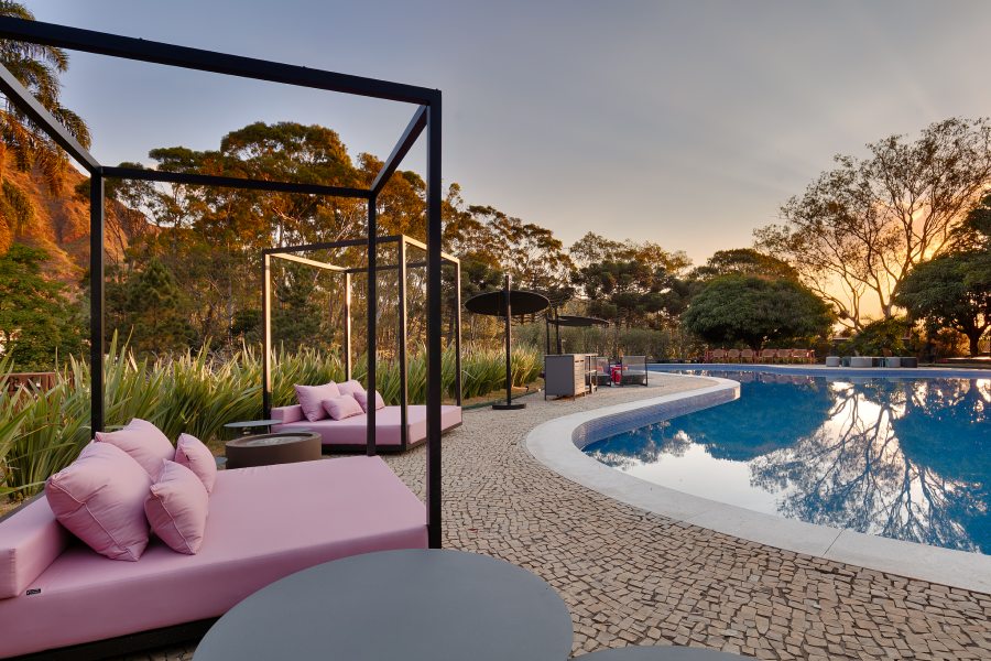 Um ambiente de descompressão, de convivência e também de contemplação de um entorno único que tem como moldura a Serra do Curral. A peça principal, um elemento arquitetônico com ares de intervenção artística, de estrutura metálica vazada na cor do aço corten, foi formatado em curva áurea e posicionado estrategicamente. Um extenso banco em madeira muiracatiara acompanha o movimento em caracol que tem, ao centro, uma escultura feita com pedaços de troncos de madeira e trançados de cestas. A peça, instalada sobre um deck com a mesma madeira do banco, comunga o espaço com duas outras áreas, delimitadas pelo mobiliário, entre sofás, chaises e mesas baixas de diferentes alturas com tampo de mármore tricolor, em branco, vermelho e verde. Na saída do deck, um corredor com painel de madeira ripada flutua sobre ele e tem, em frente, uma parede de espelhos, espaço onde estão presentes dois balanços.
