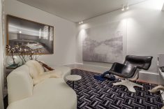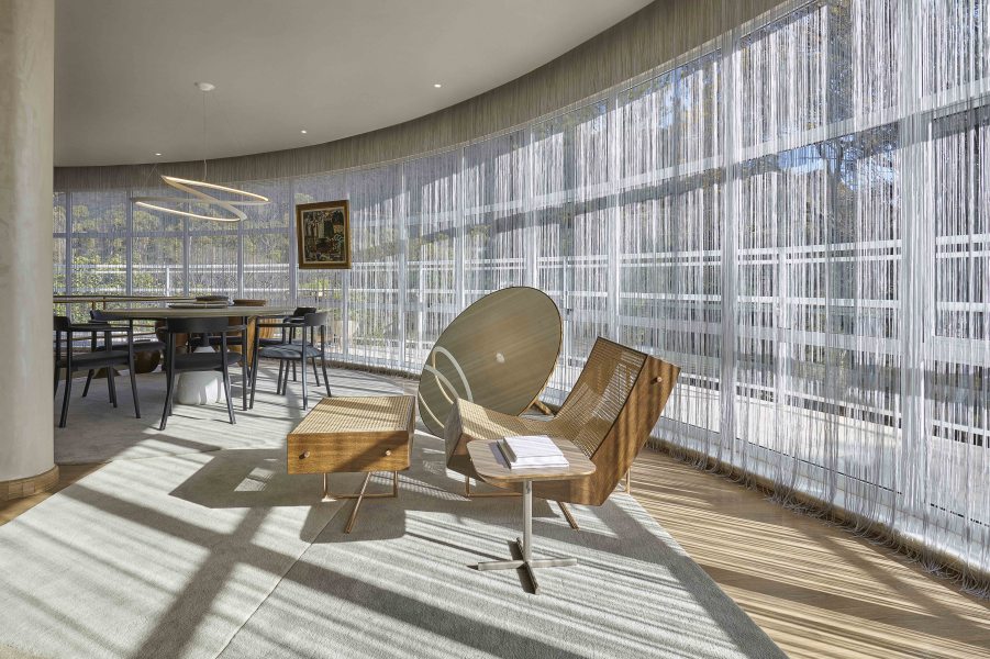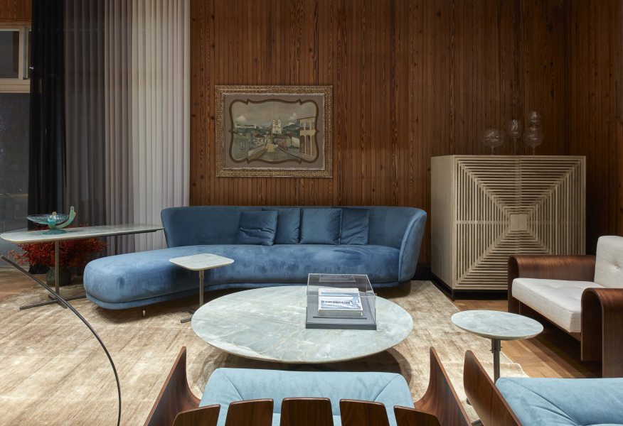 Não poderia ser diferente: para um espaço tão nobre, os gigantes do design brasileiro marcam presença em grande estilo e mostram que o sofisticado pode ser muito aconchegante, mas pode estar longe de afetação. Pelo contrário. Ele está na beleza da mesa pétala, de Jorge Zalzupin, autor também do instigante banco onda em frente ao claro e amplo sofá em linhas orgânicas. Está na pequena poltrona em madeira e estofada também, de Zanine Caldas, na gostosa Tonico, de Sérgio Rodrigues – acompanhada de duas mesinhas Maria Sem Vergonha, da Etel – e, ao fundo, na eterna poltrona alta, pufe e mesa lateral, tudo assinado por Niemeyer. O toque contemporâneo fica por conta da cadeira cabrita, de Osvaldo Tenório e da iluminação, o recorte de um círculo que se desloca em diagonal no teto. Aqui, tudo conversa com tudo, inclusive as obras de arte, de Gabriela Machado, Isaura Pena e os banquinhos, que são instalações de Zé Bento.