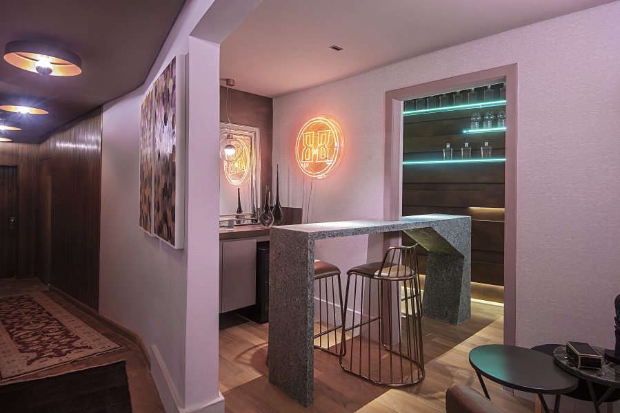 Brincando com o conceito formal de um bar e aproximando-o de seus usuários, o bar do cinema deslocou a bancada para o centro do ambiente, deixando livre circulação de todos os lados. O mesmo foi feito com o painel de exposição de bebidas que está ao alcance de qualquer pessoa e não somente do mixologista, que estará presente, criando novas receitas de drinks. A bancada foi revestida em ecogranito e o painel, feito em MDF cortem, com vidro nas prateleiras. Um lounge com pufes e mesinhas de apoio foi, pautado em design de linhas leves, complementam o ambiente, que tem papel de parede aconchegante texturizado em rosa seco e piso em parquet de peroba, da Terratile.