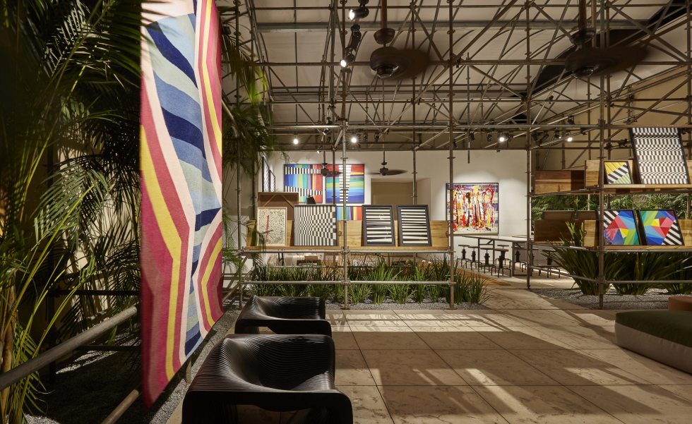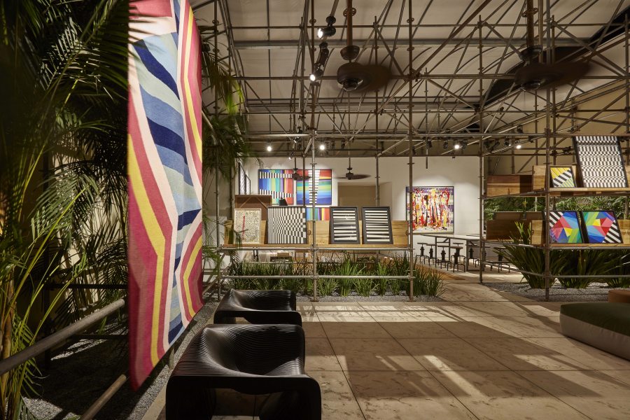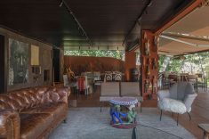 Um estúdio galeria, pensado para que o artista possa produzir e também expor seu trabalho. Utilizando de muita criatividade para sair do formal, o espaço é todo desmontável, com estrutura feita em andaimes multidirecionais e cobertura em sombrite, material fácil de instalar e também de remover. Ele foi todo pensado dentro do conceito da sustentabilidade, gerando o mínimo de lixo em sua execução. São dois vãos livres de cinco metros, cada um destinado a uma finalidade. O piso cimentício de chapas grossas é rústico e tem traços que remetem ao travertino. No primeiro vão, foi criado um estar em paleta neutra para contrapor o colorido das obras, com sofá modular e poltronas assinadas Mula Preta e proposta bem no estilo galeria de arte. No outro ambiente, o de trabalho do artista, destaca-se o armário em laca vinho fechado e a mesa com estrutura metálica e tampo em porcelanato e banquetas, em pegada industrial. Foco também no tapete, um capacho em fibra de coco e no verde do paisagismo que está por toda parte.