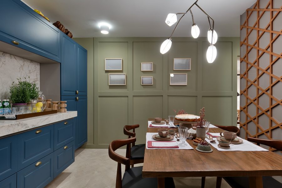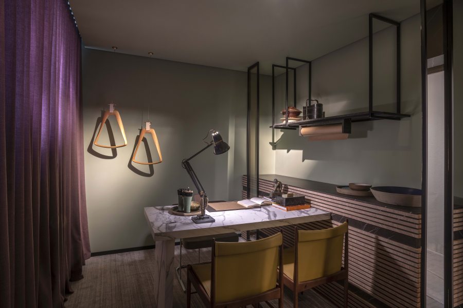 Quantas histórias já foram contadas na copa do Palácio, lugar que é retaguarda de grandes eventos, encontros e recepções? O projeto foi criado a partir daí, dos bastidores de uma copa nas casas mineiras e o desafio foi atualizar o espaço, para receber outros usos, além de ser meramente funcional, com o aconchego de luz e texturas que transformem o ambiente em local de convivência e encontros. Assim, ele abusou de cores, texturas e cuidados para transformar um ambiente técnico e funcional em um ambiente social. Nos detalhes, os bordados, as receitas, o carinho, o cuidado. E como Minas têm muitas tramas, do barroco, do rococó e art déco e tem também madeira entalhada em formas, cores e acabamentos requintados, que despertam admiração em quem vê, o espaço foi pensado em várias texturas, num conjunto sem hierarquia, apresentando à madeira laqueada, o piso laminado, a madeira bruta e o rendilhado de MDF cru com desenho autoral das arquitetas, cortado a laser. As portas foram emolduradas em placas de gesso acartonado, com resultado clássico e limpo e as paredes, revestidas em piso laminado e também em rodapé, pintado com tinha coral verde. Também se destaca a bancada e revestimento de parede em mármore branco Paraná, um mármore carrara nacional, o trabalho da artista Isis Gasparini.