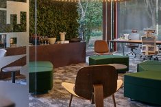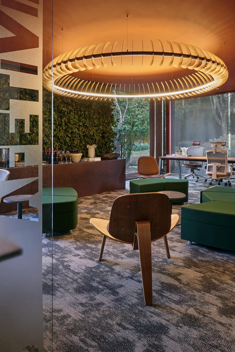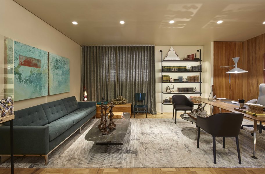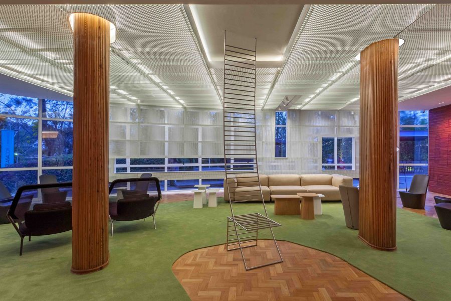 Um espaço nobre que se vale de elementos impactantes para reforçar essa ideia de nobreza, fugindo de uma solução óbvia que seria a de apresentar apenas peças decorativas. O primeiro desses elementos de impacto é um tapete orgânico em cor sólida, o verde, que abraça os pilares e vai se derretendo no meio do espaço, como um convite a quem está entrando. A tela que cobre a fachada que dá para o poente e ganha potência no teto impressiona sem conflitar: controlando a luz natural, ela se impõe no lugar da cortina e serve ainda para outras funções, embutindo a iluminação e também as caixas de som. Lembra o muxarabi, trazido para o Brasil pelos portugueses e muito usado no Brasil Colonial, que aqui ganha linguagem contemporânea. Em respeito ao piso original em peroba, todas as peças de parede foram atirantadas. É o caso do espelho gigante que rebate o espaço e trás o verde da área externa, que, assim, também participa da cena de forma mais efetiva. Uma única obra de arte foi eleita para o projeto. Presente na também única parede cega, ela vai de parede a parede, do teto ao chão e, além de levar cor para o espaço, faz referência sutil aos grandes painéis da época modernista. Trata-se de um trabalho feito exclusivamente para o lugar a que se destina, assinado pelo mineiro Fernando Luchesi. A cadeira que se assemelha a uma escada, desenho do arquiteto Gustavo Pena é uma licença poética em meio ao mobiliário, que utiliza somente dois modelos da Vitra, que se repetem em layout solto.