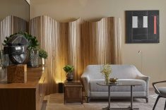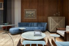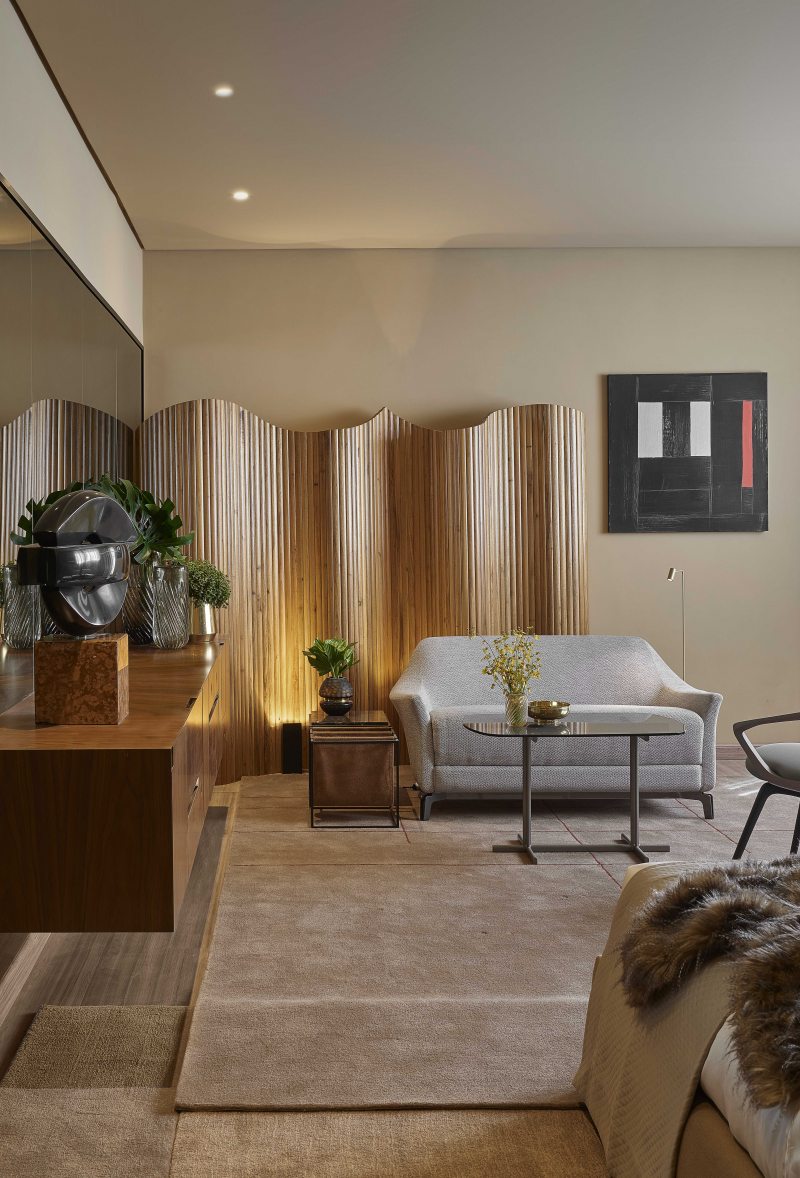 Leveza, fluidez e a presença marcante do design mineiro e brasileiro em uma composição harmoniosa permitindo que todos os ambientes – estar, jantar, lareira e TV – conversem. A base neutra das paredes dá ainda mais destaque a essa proposta e o painel em carvalho é elemento em contraponto a Serra do Curral que, dali, pode ser amplamente admirada. A persiana em sofisticado franjão de seda, que perfaz toda a extensão da varanda, colabora para não obstruir a paisagem. O tapete, desenho das arquitetas, também tem o objetivo de unificar todo o espaço. O jantar foi colocado estrategicamente em relação à janela, com mesa de seis lugares, cadeiras assinadas por Aristeu Pires e pendente de destaque. Dispostos em conjunto, grandes vasos de barro dão o toque de mineiridade, bem como a tela de Inimá de Paula que dá sensação de estar solta no espaço. O imenso sofá cinza claro do estar também foi desenhado pelas arquitetas e tem mesa de centro assinada por Jáder Almeida e, sobre ela, escultura de José Bento. No mesmo ambiente, o impacto da poltrona ferrugem Underconstruction, de Pedro Franco. Na lareira e TV, o clima intimista é reforçado por três confortáveis poltronas. Criando uma noção de ambiente à parte e comungando do charme do bom design presente no todo, a poltrona em madeira e palhinha e pufe de Gustavo Bittencourt e o grande espelho circular unem o moderno ao contemporâneo e vira ponto de convergência do olhar. Na iluminação, pontos focais discretos.