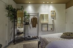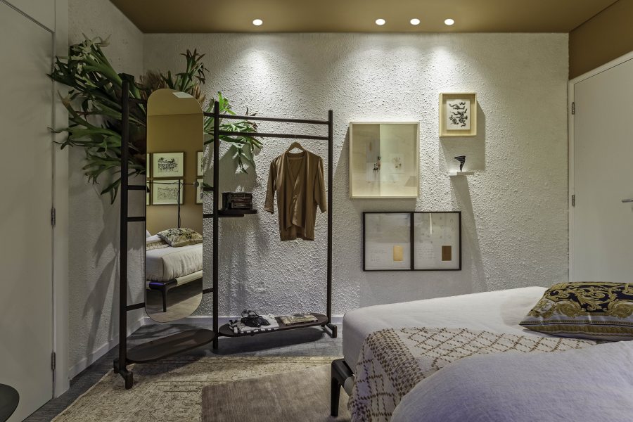 A característica da hospitalidade mineira foi trabalhada neste projeto dentro de um conceito de elegância e suavidade, trazendo-a para a atualidade. Ele busca, ainda, conversar com a ideia de que o cômodo faz parte da arquitetura do palácio, o que é impossível de ser descontextualizado. A fluidez do layout tem a ver com o tempo presente, de mutação: muda-se muito mais facilmente de apartamento, de cidade, de país do que em outros tempos. Por isso, a utilização de móveis híbridos, fáceis de carregar. Os principais, cama e armário, foram desenhados a quatro mãos, pelos arquitetos e pela Franccino. A cama tem linhas suaves, cabeceira mais orgânica e uma leveza implícita no desenho limpo e no material, o couro em off White, além do contraste da madeira escura nos pés. O armário, em madeira, é híbrido: serve de arara e apoio para que o usuário se organize. Nele, há um espelho acoplado e uma mesinha, com uma caixa de joias de época. A luminária, da Templuz, é toda em ferro, com detalhes em pedra sabão e coluna de vidro e cúpula que pode ser ajustada para cima ou para baixo. A poltrona tem tecido em trama, toda branco off White também. Destaque para o luxo sem pretensão, da roupa de cama em linho amassado e seda, de Arthur Matos, juntamente com a manta de origem quilombola e a almofada Versace, mostrando que nenhuma peça é menos luxuosa que a outra. Na prateleira inferior do cabideiro, outro detalhe sensível: a presença de algumas roupas de grifes brasileiras que tem em seu histórico o trabalho escravo e, pisando sobre elas, um sapato vegano: hipocrisia à toda prova.