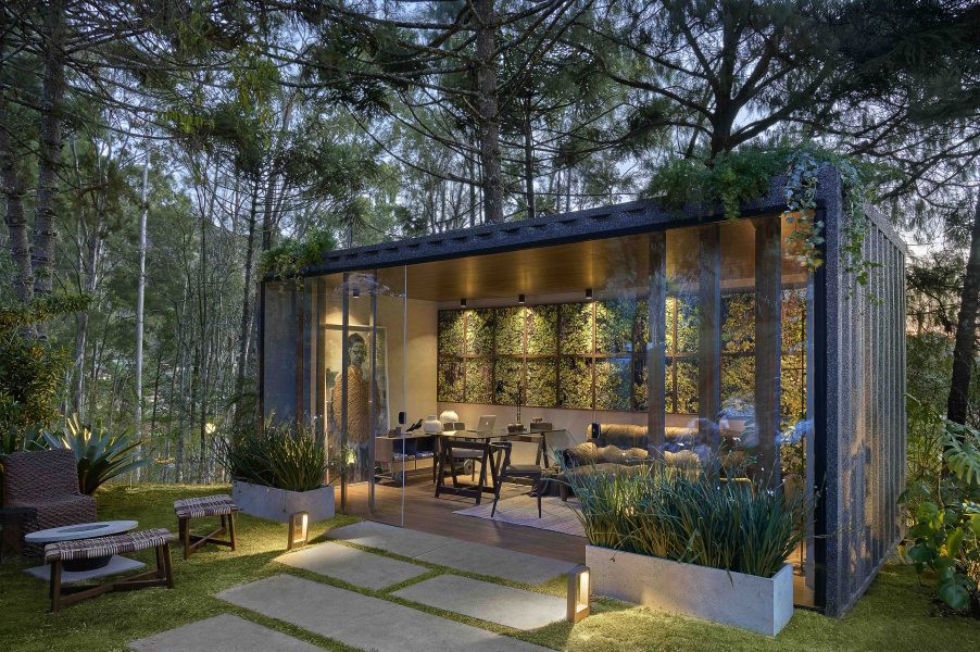 Entre árvores, com o paisagismo como elemento potente, e projetado em U que abraça as árvores mais densas, o espaço tem layout variável e mutável para receber palestras e lançamentos. Um lounge com mobiliário em corda náutica deixa a entrada mais convidativa e dá visadas interessantes para outras paisagens do entorno. A permeabilidade visual é obtida pela utilização de brises que, na fachada frontal são móveis e, na posterior, fixos. A estrutura metálica na cor chumbo foi projetada para não causar interferências e, ao mesmo tempo, permitir que a pegada industrial promova um contraste com o entorno. A iluminação tem balizadores no piso e trilhos no teto e ainda algumas luminárias de chão. O mobiliário recebeu tons complementares: azul fechado, verde militar, bege e preto. Para o piso foi especificado um emborrachado em material reciclado de pneu.