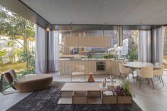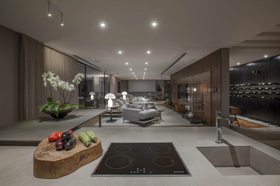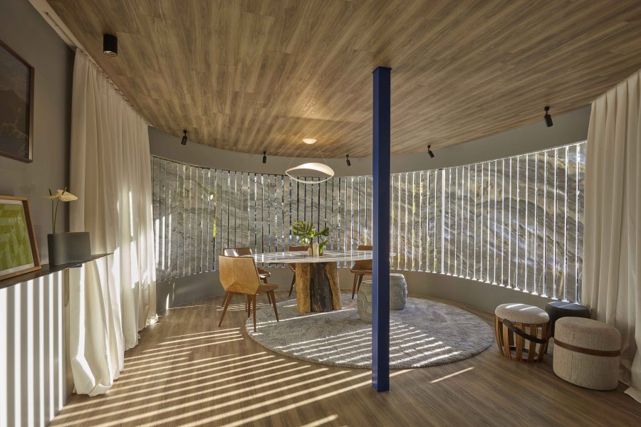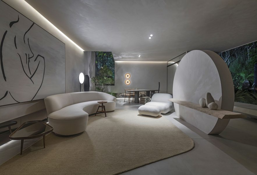 Um ambiente que se propõe sem limites entre o interno e o externo e que contrasta a rigidez externa da arquitetura brutalista das placas cimentícias aparentes, em formato ortogonal, com a fluidez interna. Com living, jantar e adega, o espaço é delimitado pelo uso e não por divisões físicas e se destina à convivência e à contemplação do entorno. O layout e o mobiliário tem caráter orgânico, com poucos itens e uma paleta bem clean. A simplicidade do ambiente funciona como uma tela em branco em que as pinceladas são os móveis e a luz que toca as superfícies. Destaque para a mesa de jantar orgânica, desenhada pelo escritório em lâmina de madeira natural Grigio Italiano e para as duas arandelas douradas Vent, da Foscarini, a luminária de piso Galáxia da Archela, e a arandela da adega Arco, do Estudio Rain.