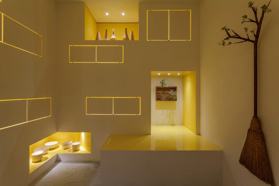 Utilizando de um conceito que se aplica tanto a projetos residenciais quanto comerciais, a louçaria foi pensada como um espaço expositivo para peças de ceramistas mineiros. Distribuídas irregularmente sobre o fechamento branco, cavidades amarelas cumprem o papel de armazenamento e exposição, além de conferirem uma linguagem quase arquitetônica à obra. A iluminação, vinda apenas dos nichos, cria um ambiente cênico, destacando as peças de cerâmica. O piso é em ladrilho hidráulico sextavado, da TerraTile e o projeto de iluminação assinado por Gabriel Pederneiras. Peças dos ceramistas Alissa Rezende, do Ateliê da Vila e Máximo Soalheiro e obras do artista libanês Camille Kachani, cedidas pela galeria Murilo Castro.