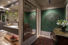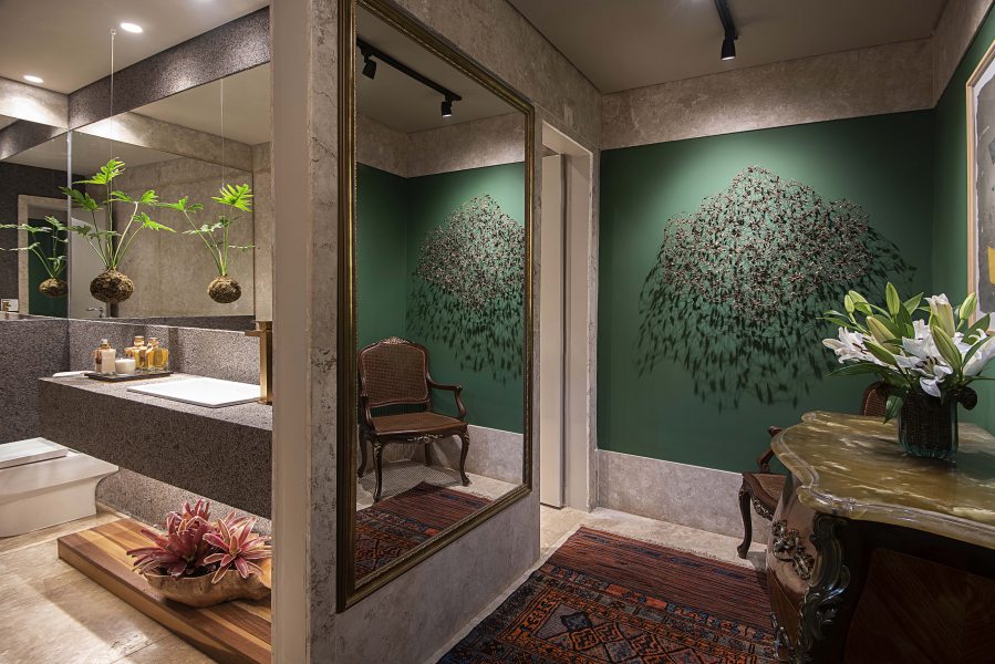 O ponto de partida concentra-se na peça principal do hall: uma cômoda bombê francesa de estilo clássico, com marchetaria frontal e tampo em mármore verde claro. Imponente e sofisticada, é a prova de que um móvel assim cabe em qualquer lugar. Aqui, ela ganha o vigor da parede em verde profundo e do tapete em verde e vermelho e é acompanhada por cadeira também em estilo francês e um espelho com moldura dourada entalhada. Foram mantidos os pisos e alisares originais. O hall serve de antessala para os dois lavabos, um masculino e outro feminino, com bancada revestida em ecogranito, parede em tecido, metais em dourado mate e um pequeno deck.