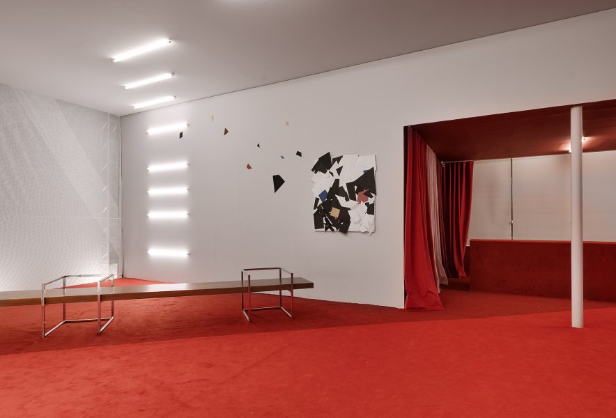 Com inspiração minimalista e gráfica, a bilheteria se vale de poucos materiais em seu projeto de interiores. No ponto principal do ambiente, dois tons de vermelho, com paginação em diagonal, sobem paredes e balcão. A ideia é criar pontos de fuga, como se fossem caminhos, dando uma direção ao olhar. A mesma linguagem também está na iluminação, mínima: algumas lâmpadas tubulares em led fazem o caminho no teto e descem por uma parede que não foi revestida. Na área da bilheteria há ainda cortinas, também em dois tons, o vermelho e o rosa. Teto e parede sem revestimento ganharam tom mais dramático de vermelho. No foyer, detalhe para o banco em madeira e para a linha de produtos desenvolvidos pela Hardy inspirados nas espécies escolhidas por Burle Marx para os jardins do Palácio. Bem à vista para o visitante que chega, eles podem ser adquiridos na saída do evento.