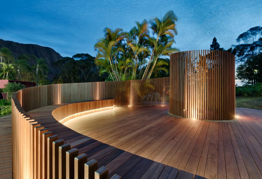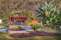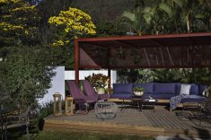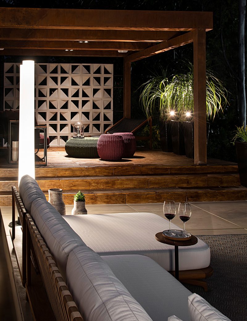 O charme desse gazebo está nos detalhes. A placa cimentícia que, na plataforma da entrada aparece em tom natural, no piso interno ganhou pigmento no tom madeira, proporcionando um aconchego visual, também proporcionado pela iluminação cenográfica, feita por colunas dispostas lateralmente. Um cobogó em tom de cimento, com mais de 3m de altura faz o fechamento entre os pórticos em aço cortem e com o impacto de um rendado. O mobiliário foi disposto sobre tapete indiano clarinho e se wharmoniza com a natureza, usando madeira e Off-White no estofado, contraponto para o sofá e poltronas. A escultura é de Amílcar de Castro e, entre os adornos, vasos, cerâmicas e lanternas, para arrematar, um espelho d’água com acabamento lateral em ecografite e três lareiras automatizadas finalizam o cenário.