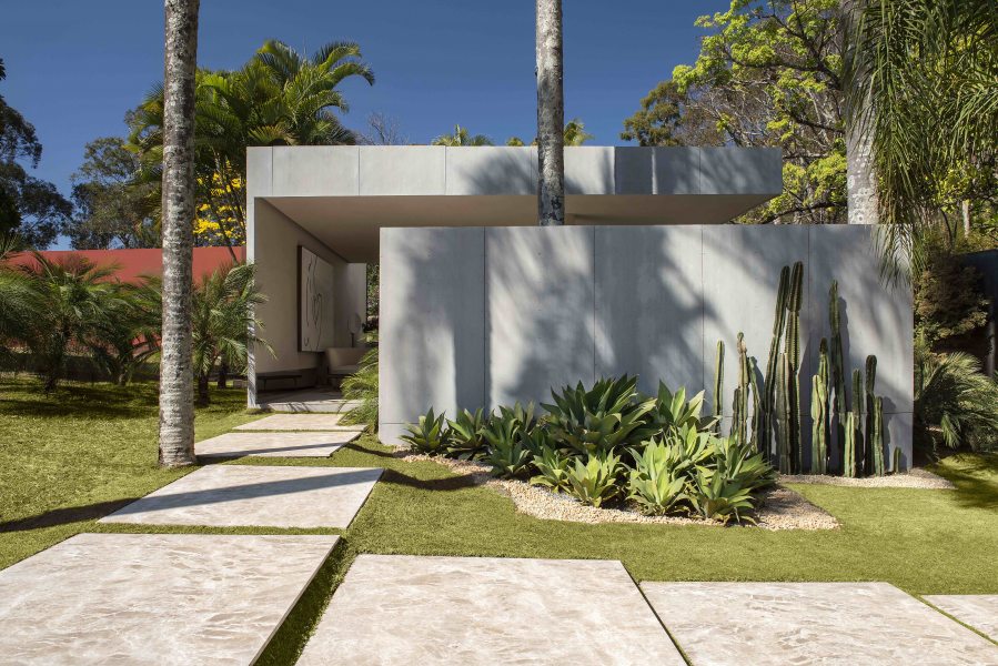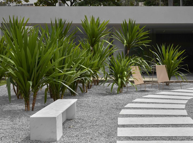 Aqui, a opção foi reforçar a sensação da rigidez do concreto da edificação com a presença de um mandacaru disposto entre agaves. Tal aridez cria um jogo estético e brinca com as sensações, já que, neste caso, o frescor vem de dentro, ou seja, faz parte do ambiente interno. Nele, um maciço de palmeiras Phoenix pode ser visto de fora e, ao fundo, uma árvore Eugênia tem a companhia de um maciço de moreias. Rita opta por utilizar poucas espécies e tem trabalho inspirado em profissionais como Luís Carlos Orsini e também Burle Marx.