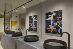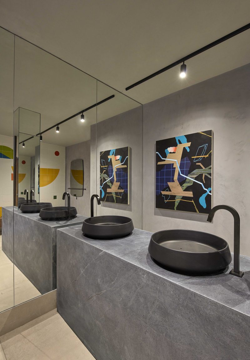 A primeira ideia foi convidar o artista Alexandre Mancini, azulejista discípulo de Athos Bulcão, que realizou inúmeros trabalhos marcantes na arquitetura de Niemeyer. Ele fez para os ambientes o painel da parede que se avista da porta, uma homenagem ao modernismo brasileiro. O piso é em porcelanato cimentício e as outras paredes receberam textura cimento: além de valorizar o trabalho de Mancini, elas exibem telas de James Kudo, um brasileiro que viu parte de sua cidade, Novo Oriente, ser alagada pela hidrelétrica Três Irmãos. Kudo trabalha em seus desenhos a memória desse lugar, que vem se transformando, ao longo da história: de floresta em cidade e de cidade em lago. A pedra sabão, elemento muito utilizado em Minas, foi usada nas bancadas que apoiam o design arrojado das cubas de Jader Almeida para a Deca. O designer também assina os bancos do ambiente. Ainda em evidência o espelho assinado por Ronald Sasson. A iluminação foi feita em trilhos no estilo industrial, com o detalhe dos spots em amarelo. Por falar em cor, ela chega como elemento surpresa, dentro das cabines, que têm fundo em laranja.